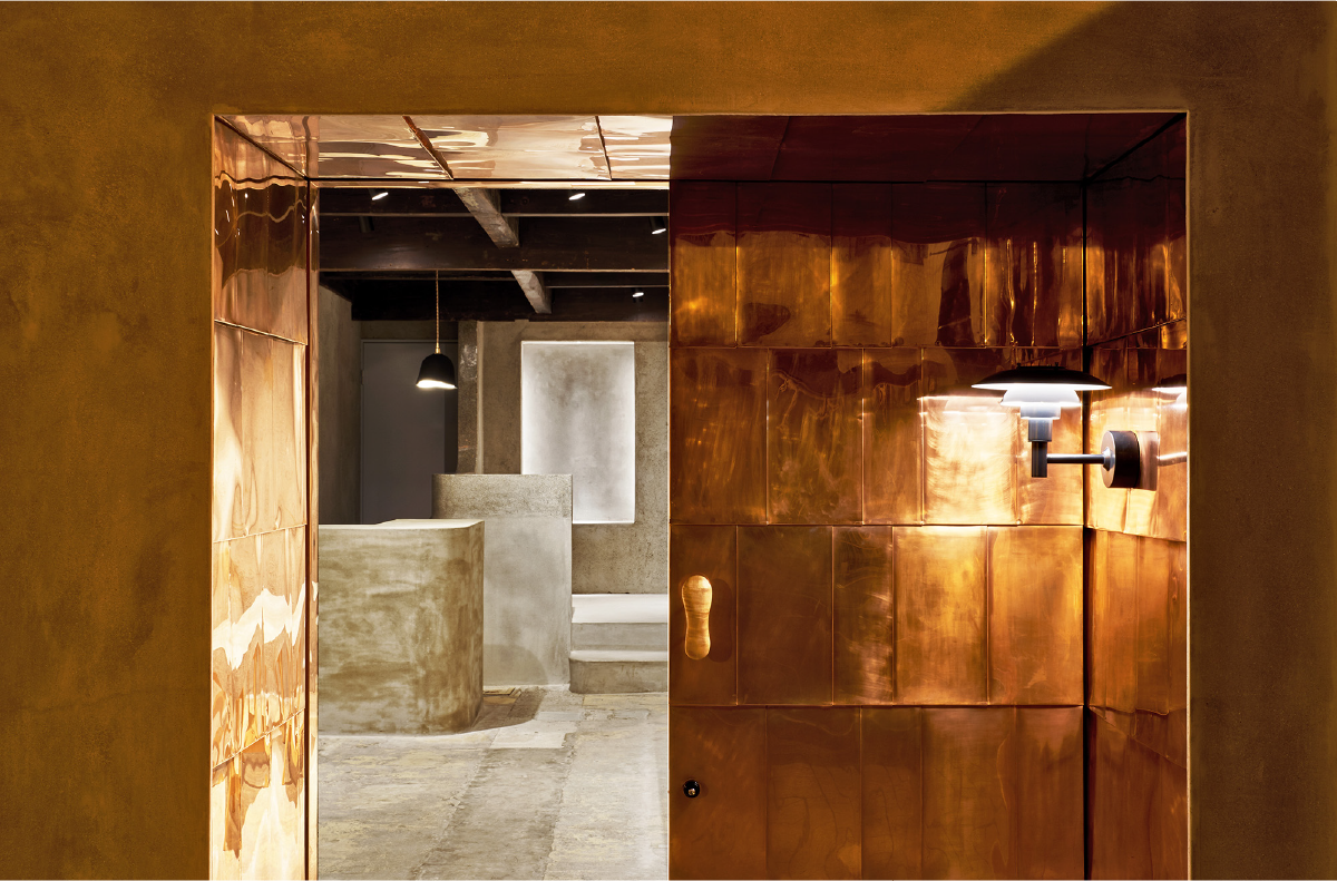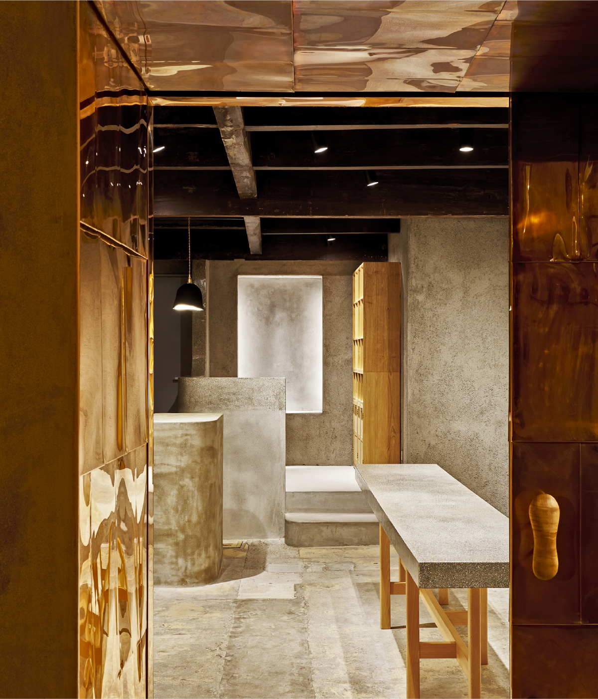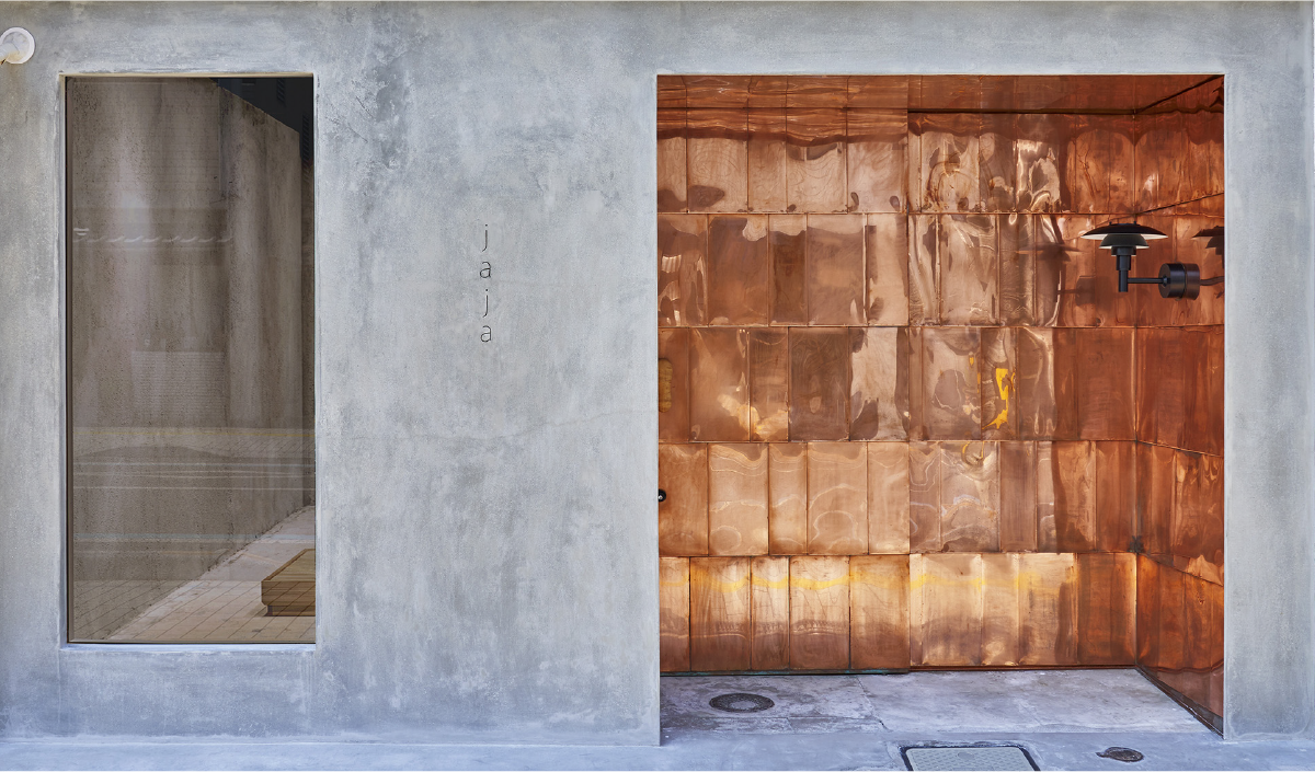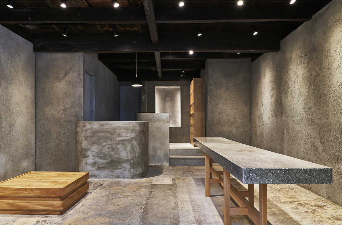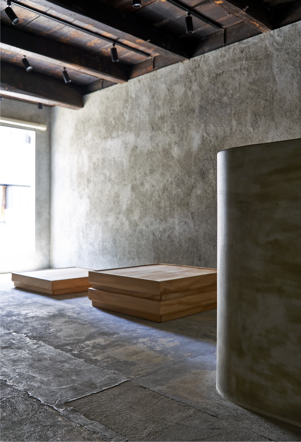 瀬戸内海の島々を繋ぐしまなみ海道の起点となる広島県尾道市。その海岸線を望む場所にギャラリーヤヤはオープンしました。ギャラリーとしての機能と手仕事を大切にした商品の常設としての機能。この2つの機能を表現するために個性的でありながらもニュートラルな雰囲気を感じれる空間を目指しました。潮風を受け経年変化する銅板一文字葺きのエントランスをアイキャッチとし、店内は既存の躯体を残しながら、左官の技法を応用し壁面や展示台の天板などのテクスチャーに落とし込んでいます。