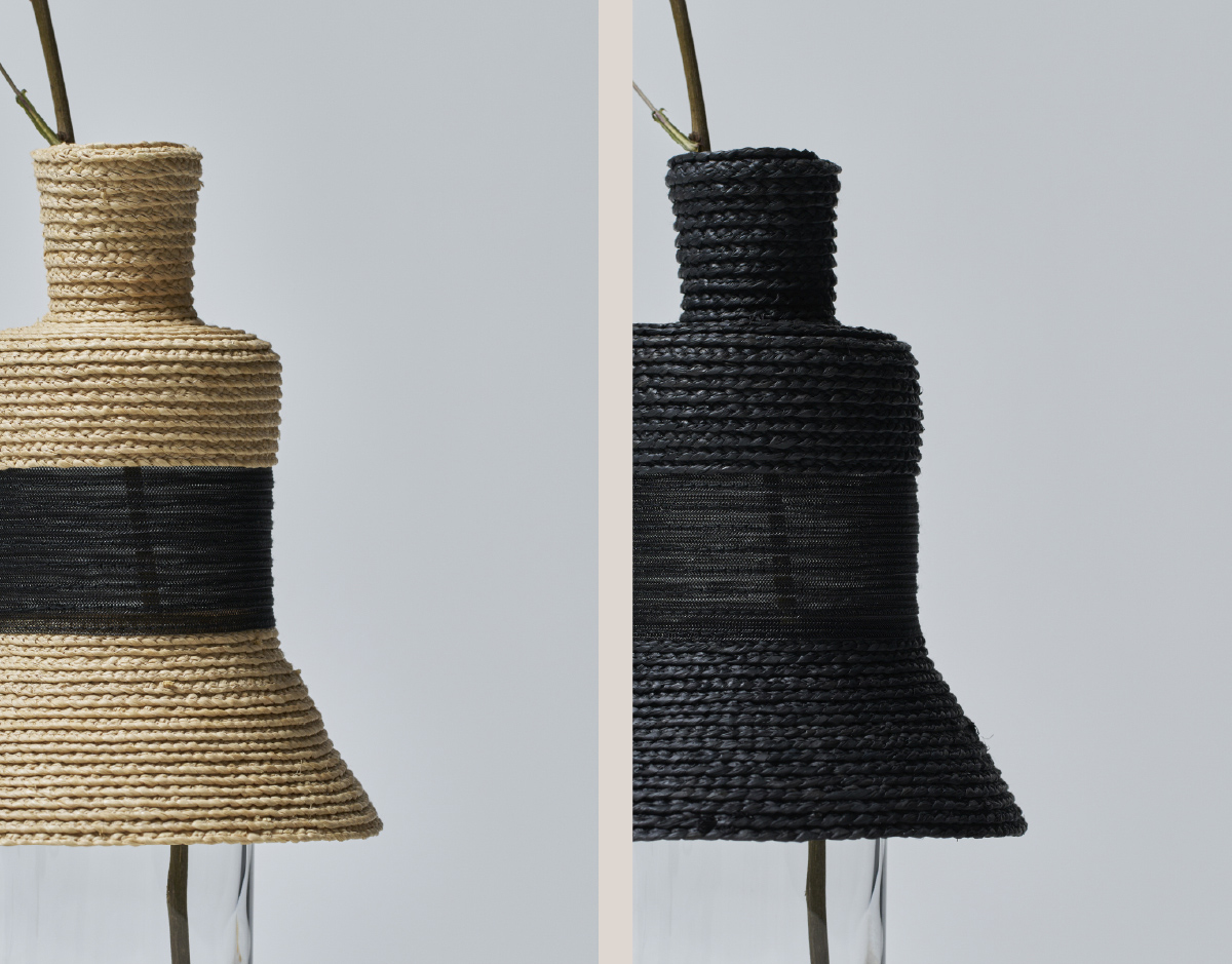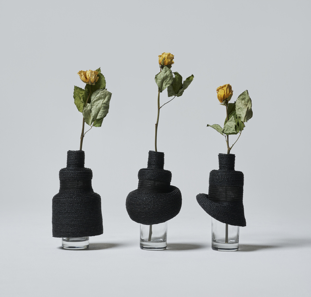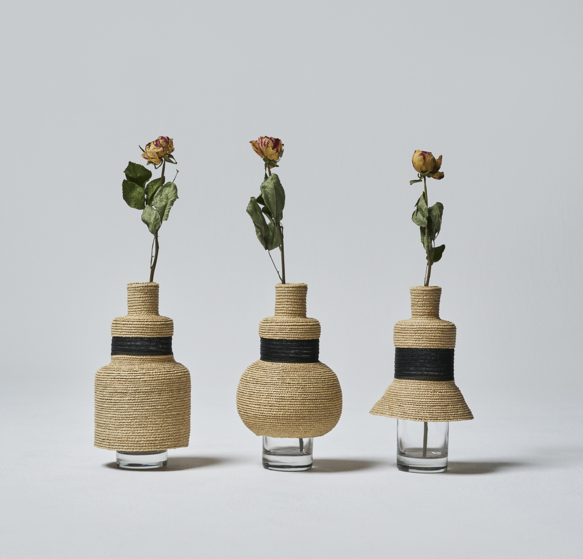 Dress up glass is a vase that is created by dressing up glass. These three distinctive vases were created by layering and simplifying round, triangular, and square shapes based on the motifs of medieval dresses and modern skirts. The basic material is raffia palm, and the section along the chest is made of see-through material. These materials create a feeling of lightness that accentuates the dress up glass. This small, lovely, skirt-like vase looks great with a single flower. Whether used as a vase to arrange flowers or displayed as an objet d’art, it matches a variety of interior environments.