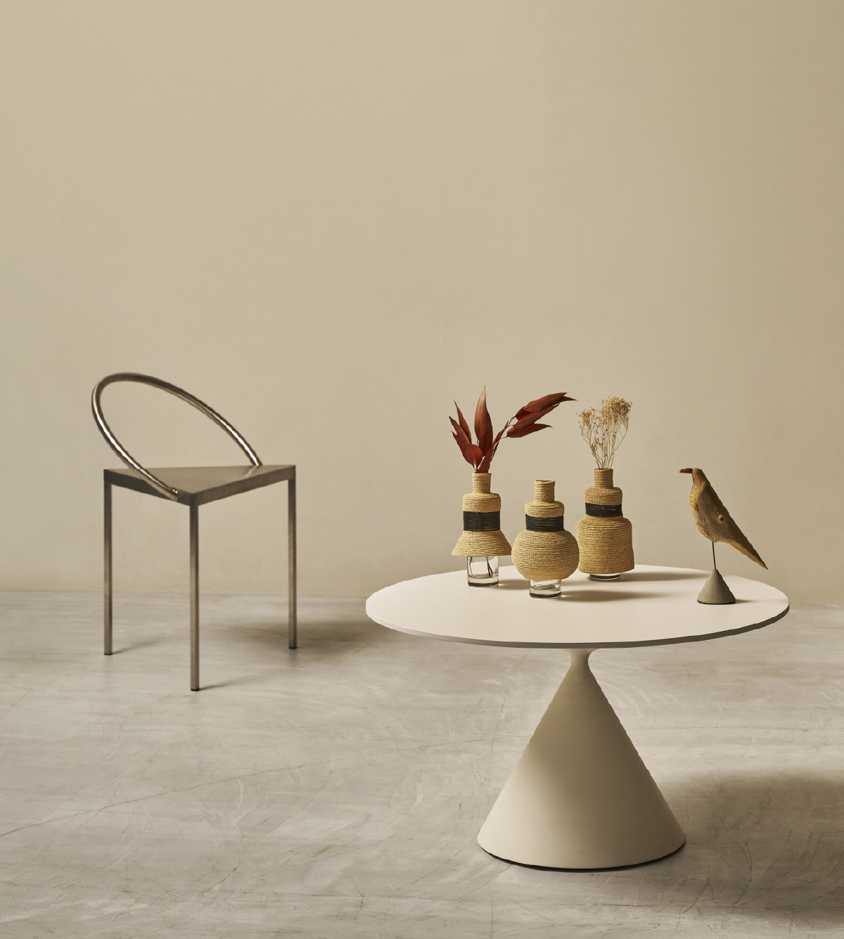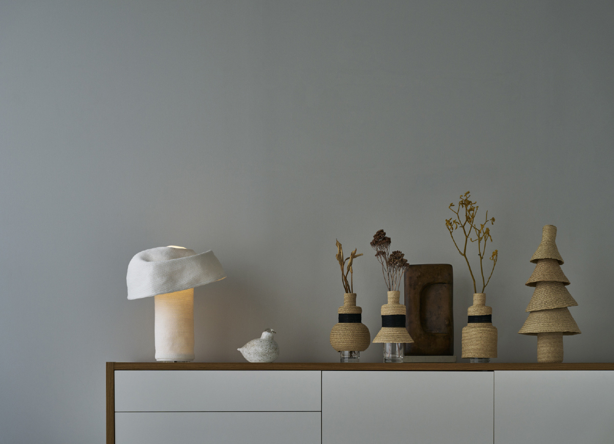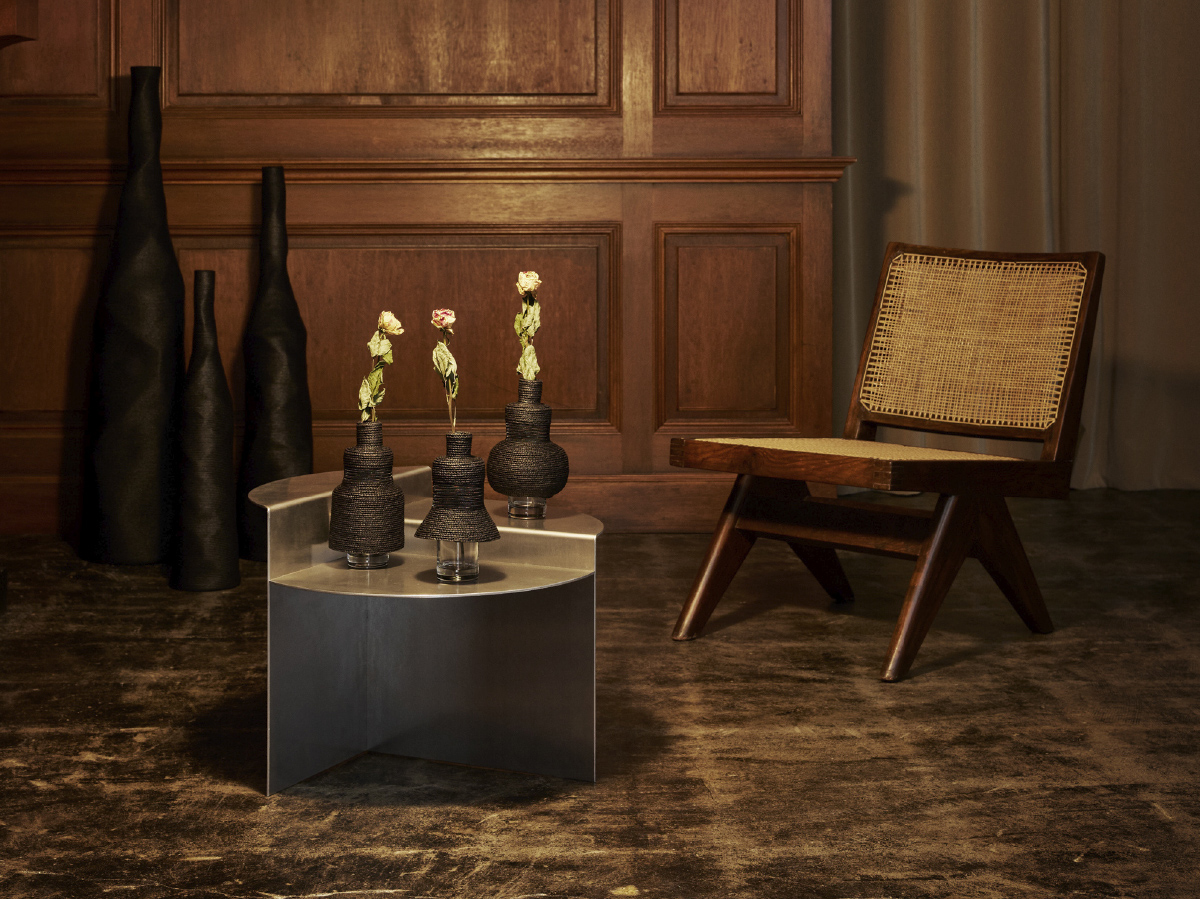 Dress up glass is a vase that is created by dressing up glass. These three distinctive vases were created by layering and simplifying round, triangular, and square shapes based on the motifs of medieval dresses and modern skirts. The basic material is raffia palm, and the section along the chest is made of see-through material. These materials create a feeling of lightness that accentuates the dress up glass. This small, lovely, skirt-like vase looks great with a single flower. Whether used as a vase to arrange flowers or displayed as an objet d’art, it matches a variety of interior environments.