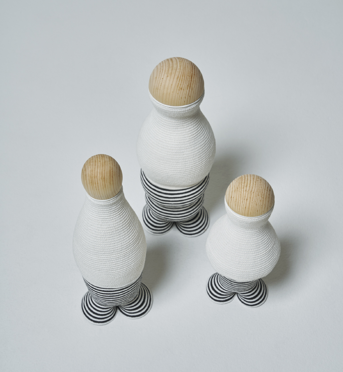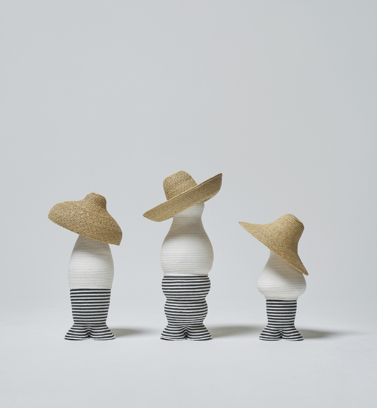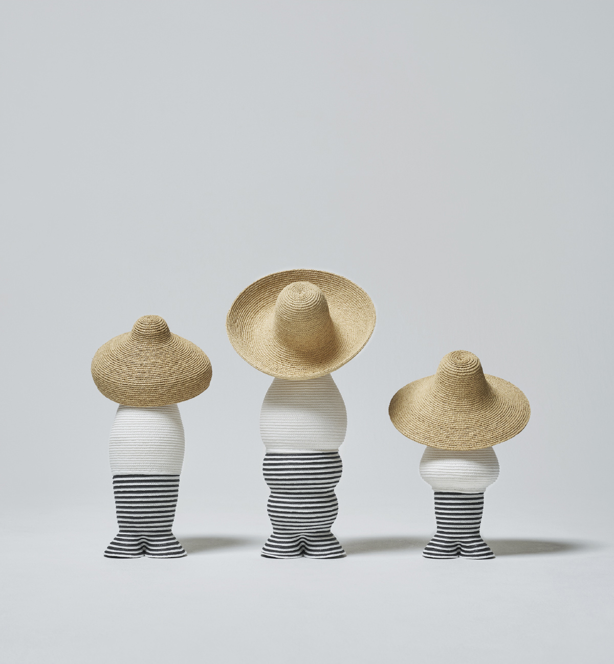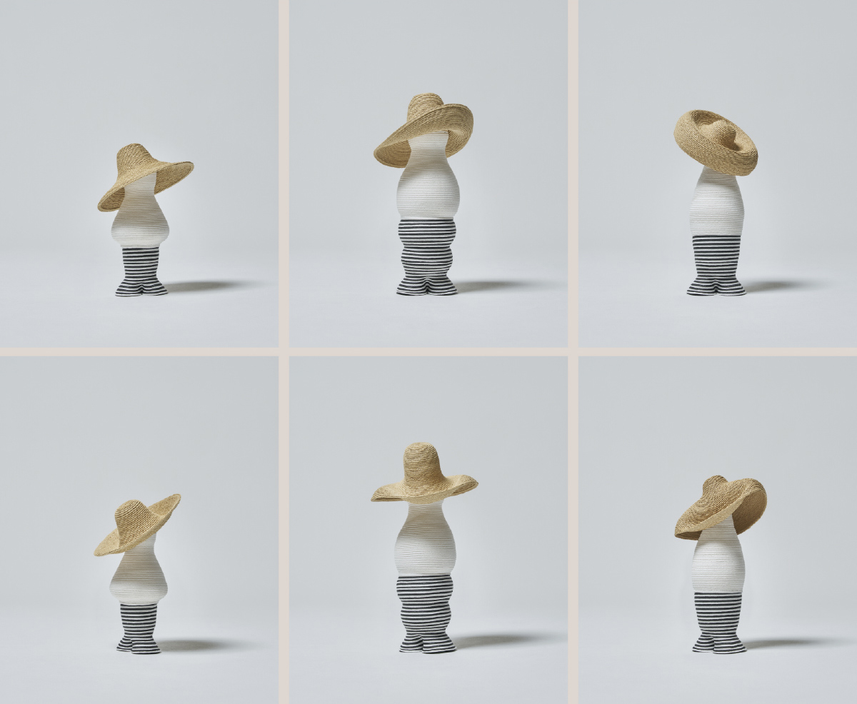 MASCOTTE(マスコット)はその名の通り、MOBJEのマスコットキャラクターです。帽子製造メーカーからはじまったMOBJEならではの帽子を被るだけのマスコットですが、帽子の被り方次第で何か訴えているような表情や意志が表れます。帽子を脱ぐと丸みを帯びた木材の頭が見えてきます。この木材の頭は日本の姫子松で成形され、肌触りの良い優しい表情は思わず撫でてみたくなります。帽子はラフィア椰子、服とストライプのパンツは和紙素材で構成され、内部の充填剤は綿と姫子松のかんなくずを混ぜ合わせ、姫子松特有の爽やかで清涼感のある香りを感じることができます。3種類のフォルムは寛大なお父さん、冷静なお母さん、無邪気な子供の様にも見えます。帽子と白い服、白と黒のストライプのパンツ。このシンプルな組み合わせだからこそ少しの変化でも感情さえも見えてきそうになります。MOBJEのマスコットは「なんとなくそう見えるね。」や、その姿を見て「どう感じるか?」等、想像を促すことを念頭に置いてデザインしています。