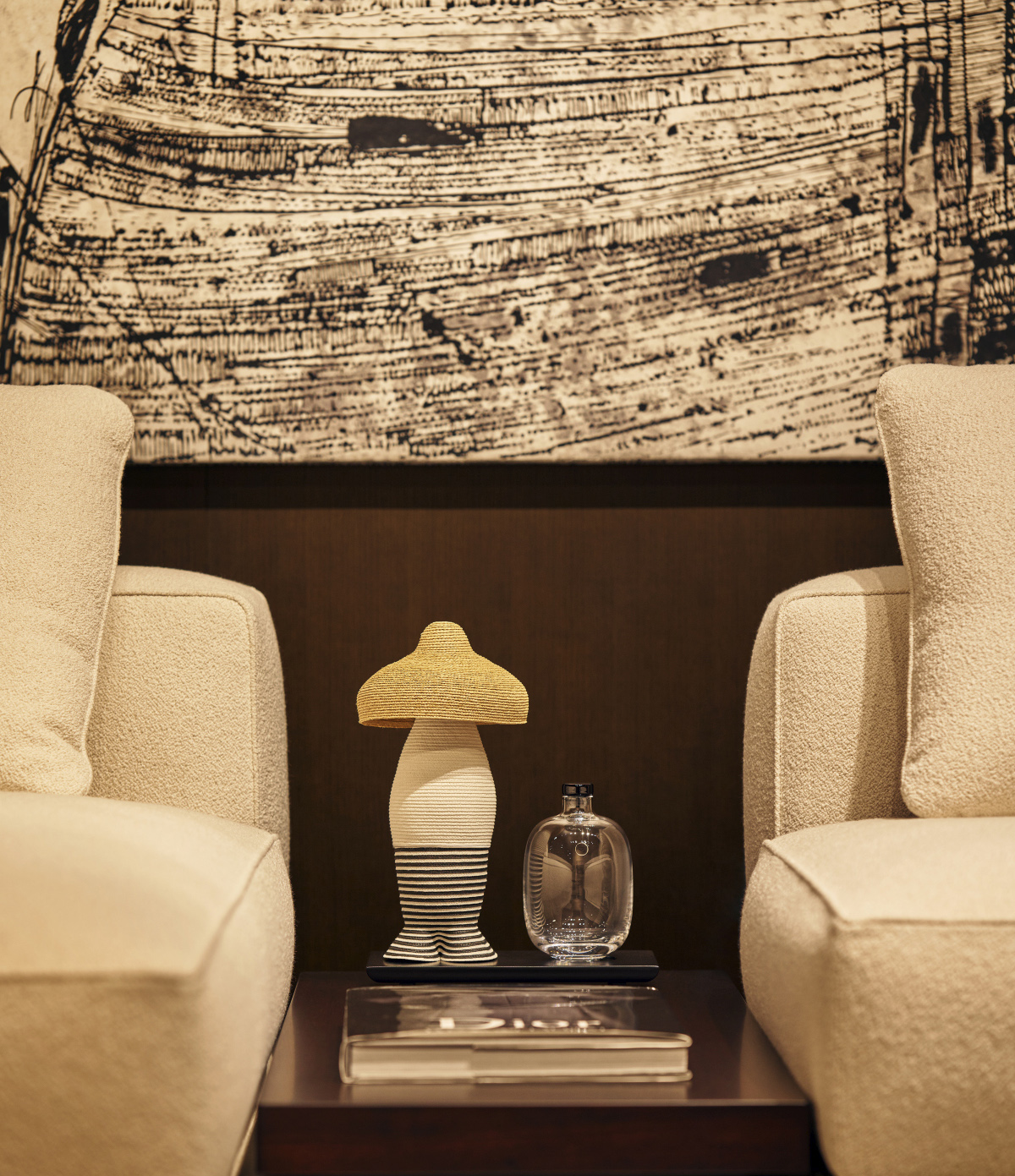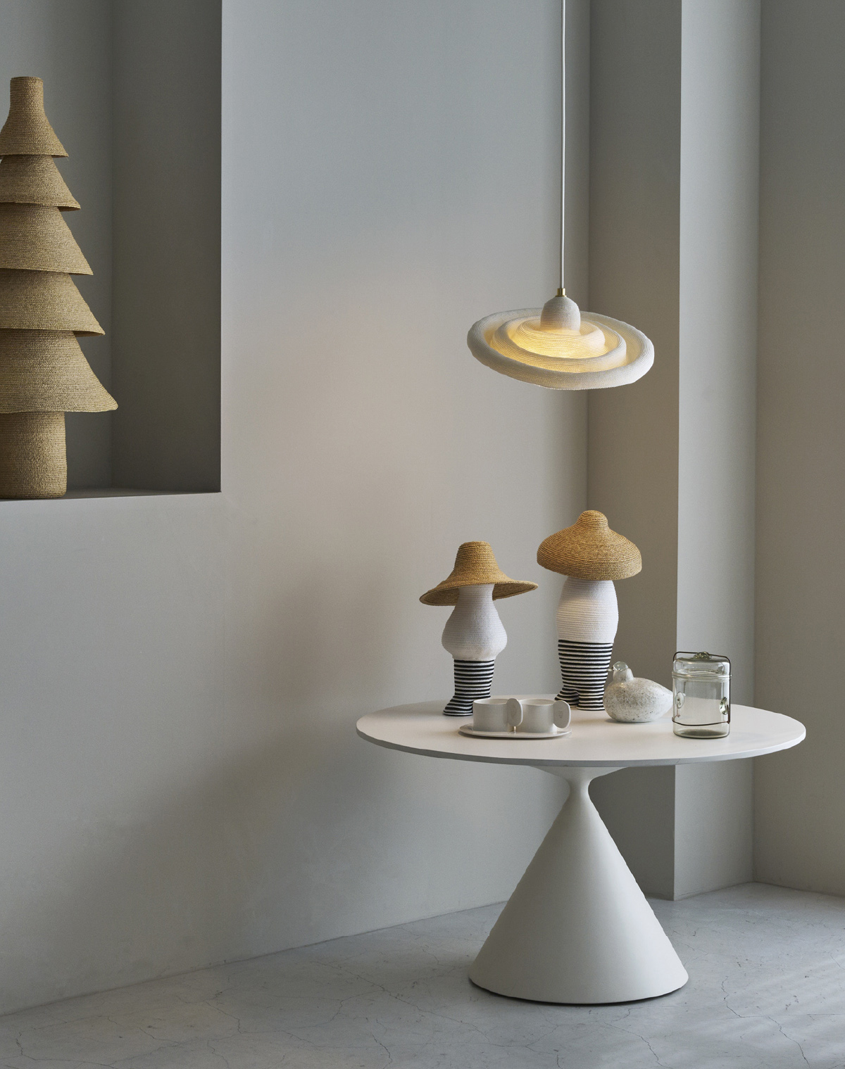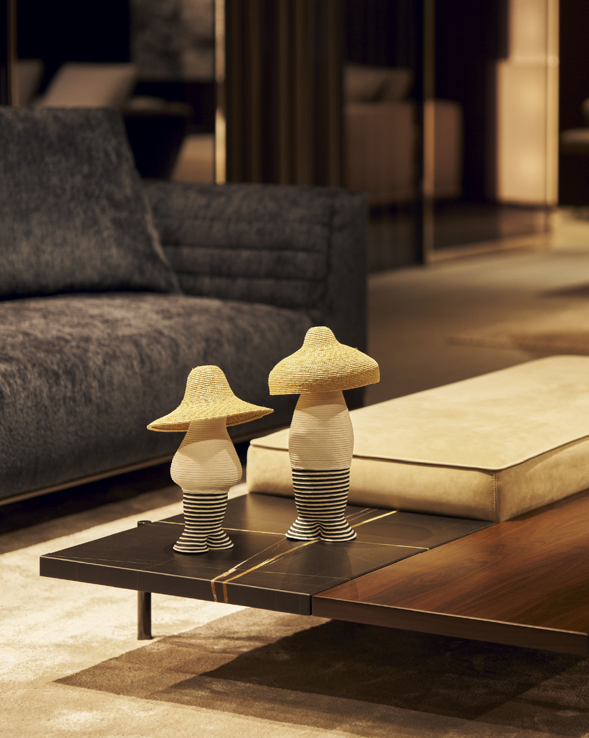 MASCOTTE(マスコット)はその名の通り、MOBJEのマスコットキャラクターです。帽子製造メーカーからはじまったMOBJEならではの帽子を被るだけのマスコットですが、帽子の被り方次第で何か訴えているような表情や意志が表れます。帽子を脱ぐと丸みを帯びた木材の頭が見えてきます。この木材の頭は日本の姫子松で成形され、肌触りの良い優しい表情は思わず撫でてみたくなります。帽子はラフィア椰子、服とストライプのパンツは和紙素材で構成され、内部の充填剤は綿と姫子松のかんなくずを混ぜ合わせ、姫子松特有の爽やかで清涼感のある香りを感じることができます。3種類のフォルムは寛大なお父さん、冷静なお母さん、無邪気な子供の様にも見えます。帽子と白い服、白と黒のストライプのパンツ。このシンプルな組み合わせだからこそ少しの変化でも感情さえも見えてきそうになります。MOBJEのマスコットは「なんとなくそう見えるね。」や、その姿を見て「どう感じるか?」等、想像を促すことを念頭に置いてデザインしています。