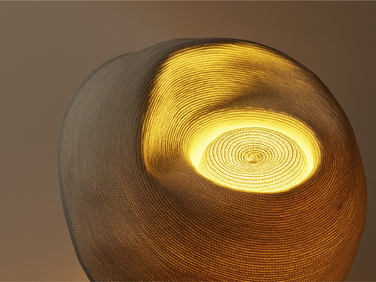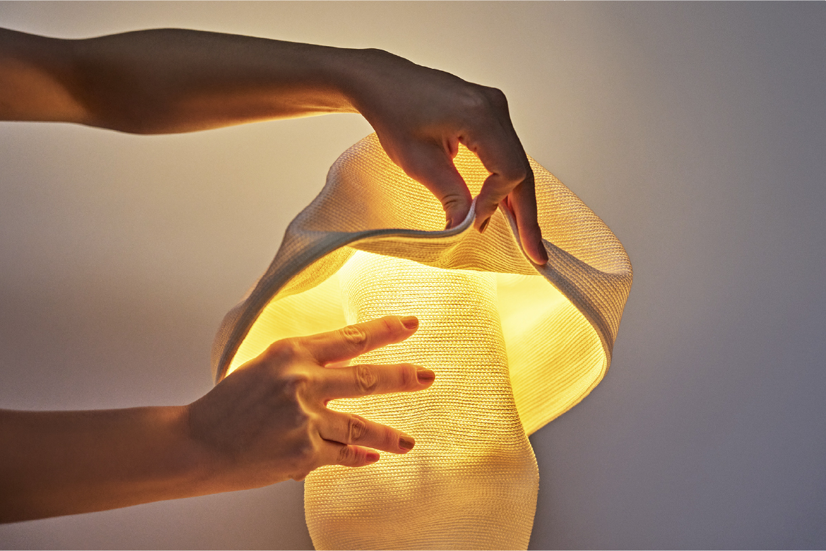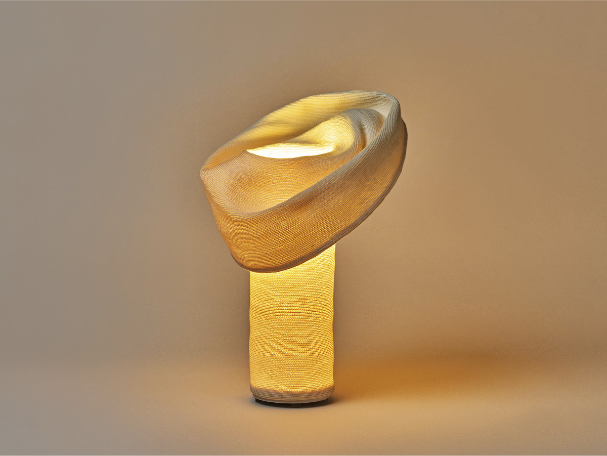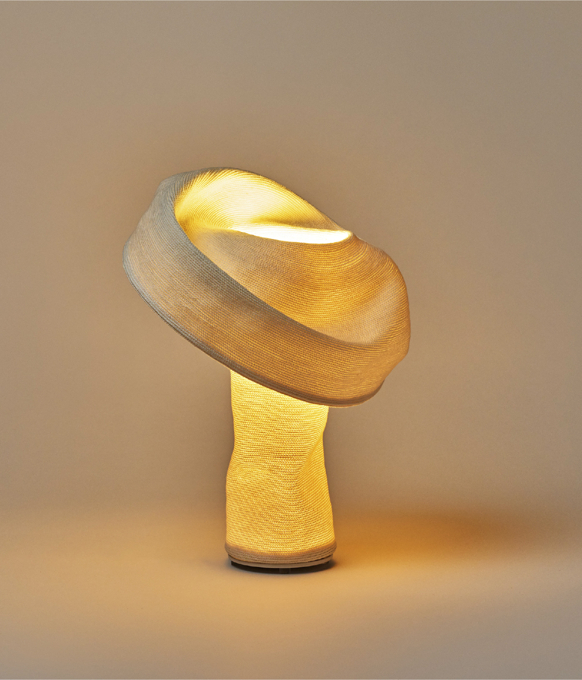 A table lamp design based on the theme of "adjusting the light." The pillars and shades are sewn together with a single string, and the seamless light gently colors the space. The single strand is a braid that was developed for these lamps. This braid, made of about 80% Japanese paper, has excellent transparency, and holds its form so that it can be molded into a variety of shapes. You can make adjustments to the light every day, by changing the shape of the base and the shade, as if you were styling your hair with moist feeling. And, don’t forget to enjoy the shadows, which can only be experienced when the lights are off.