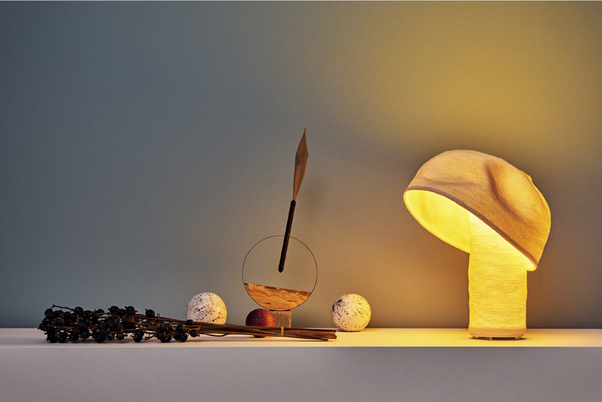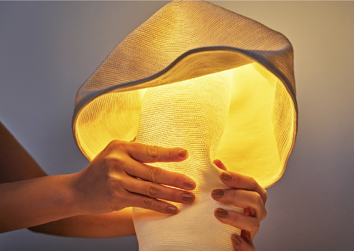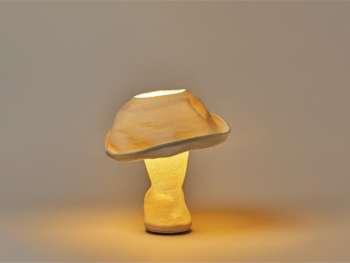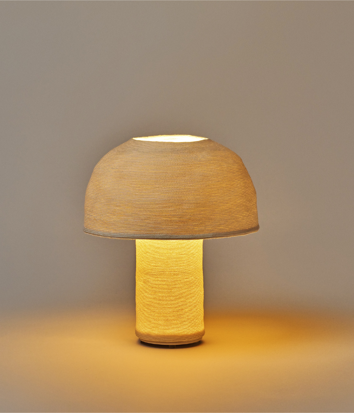A table lamp design based on the theme of "adjusting the light." The pillars and shades are sewn together with a single string, and the seamless light gently colors the space. The single strand is a braid that was developed for these lamps. This braid, made of about 80% Japanese paper, has excellent transparency, and holds its form so that it can be molded into a variety of shapes. You can make adjustments to the light every day, by changing the shape of the base and the shade, as if you were styling your hair with moist feeling. And, don’t forget to enjoy the shadows, which can only be experienced when the lights are off.