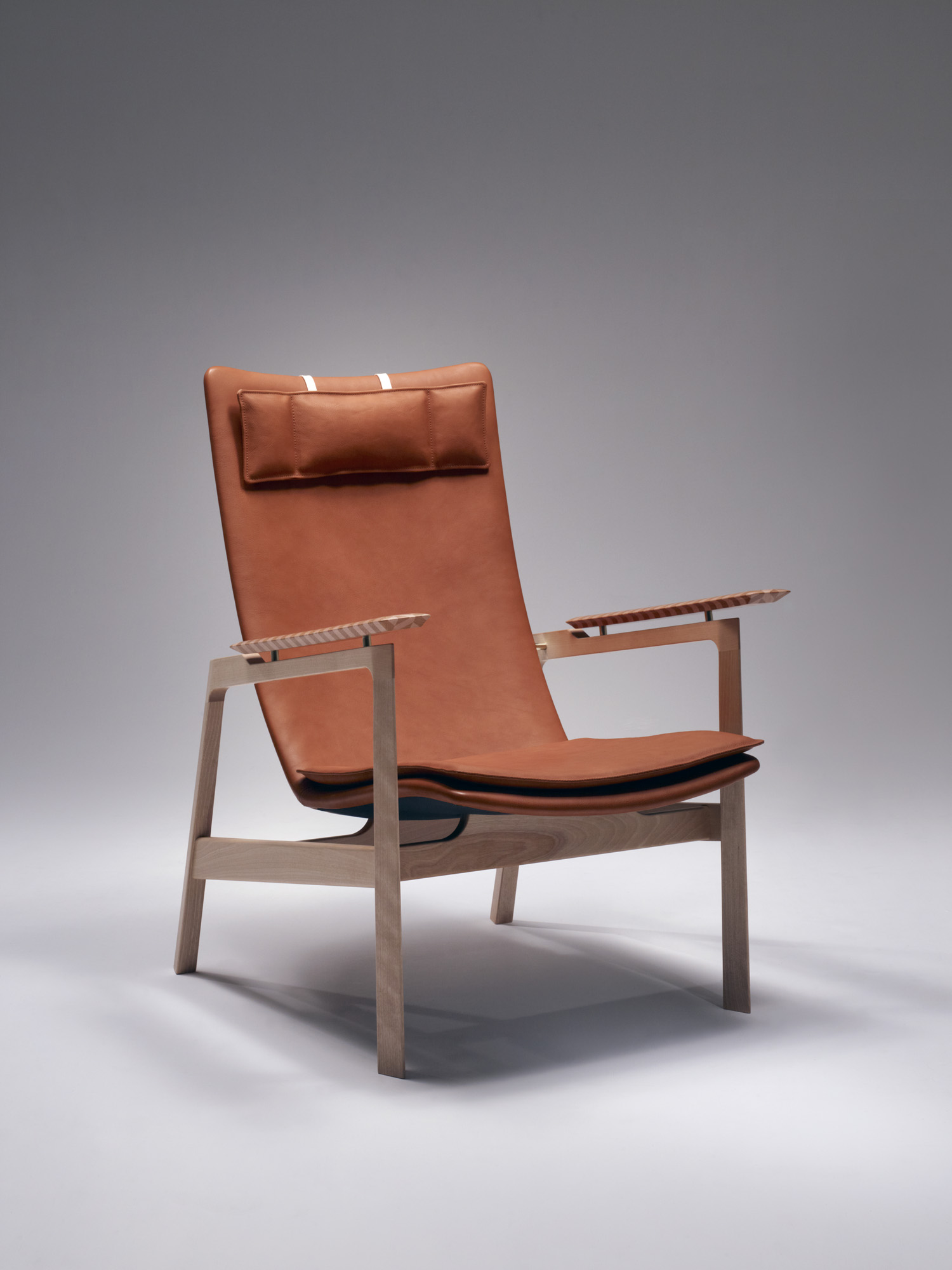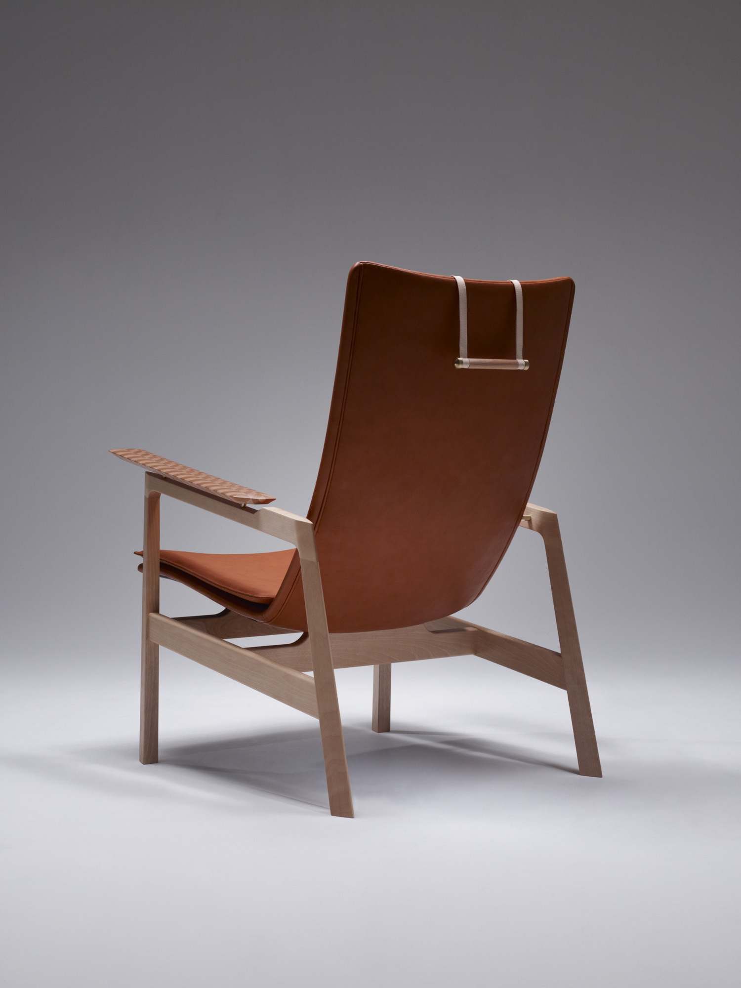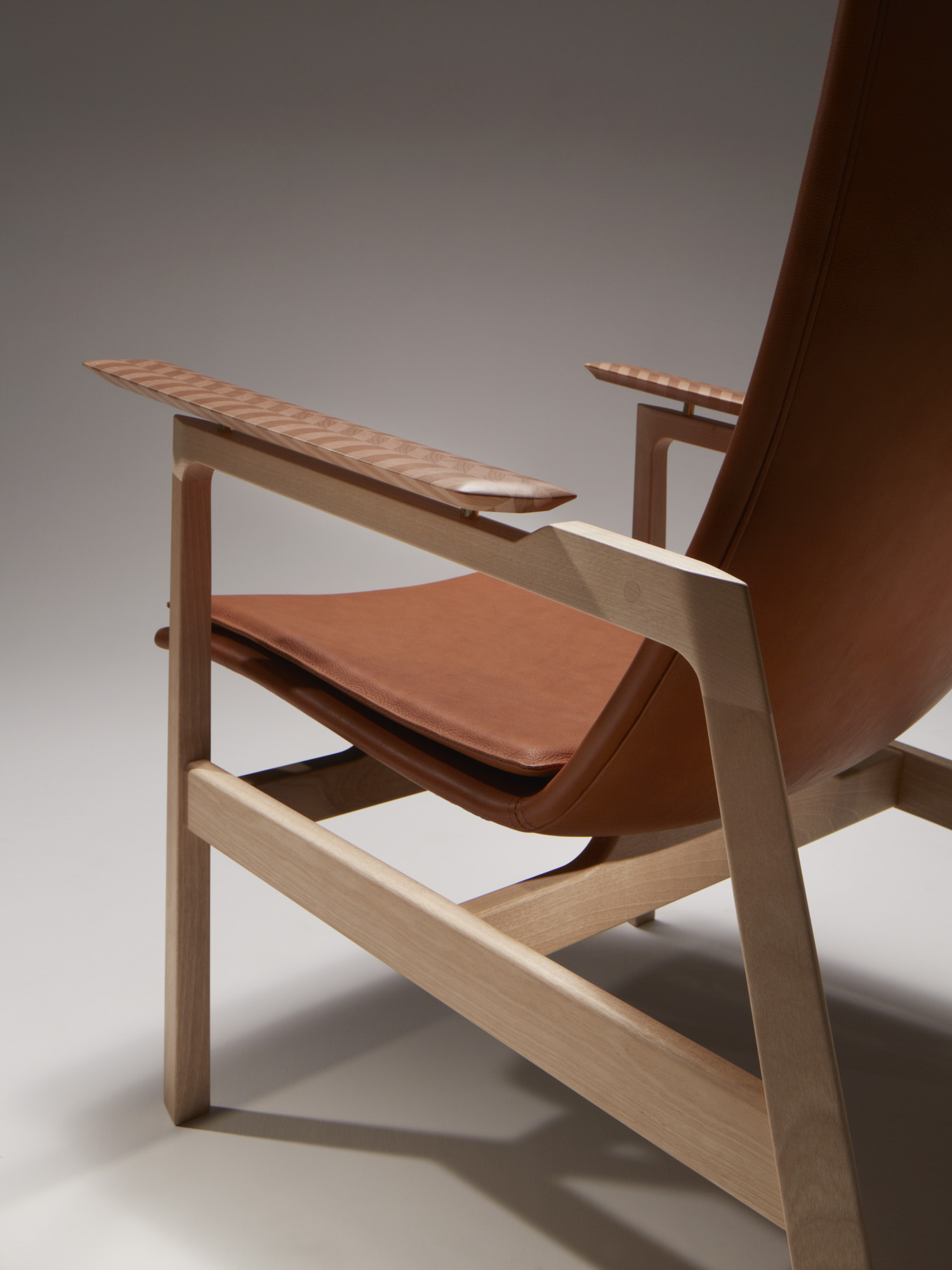 楓、桜の小口で構成されるヘリンボーンの肘を持つベカールラウンジチェアー。成形され磨かれた小口の触覚は、木材の新たな一面を教えてくれます。
