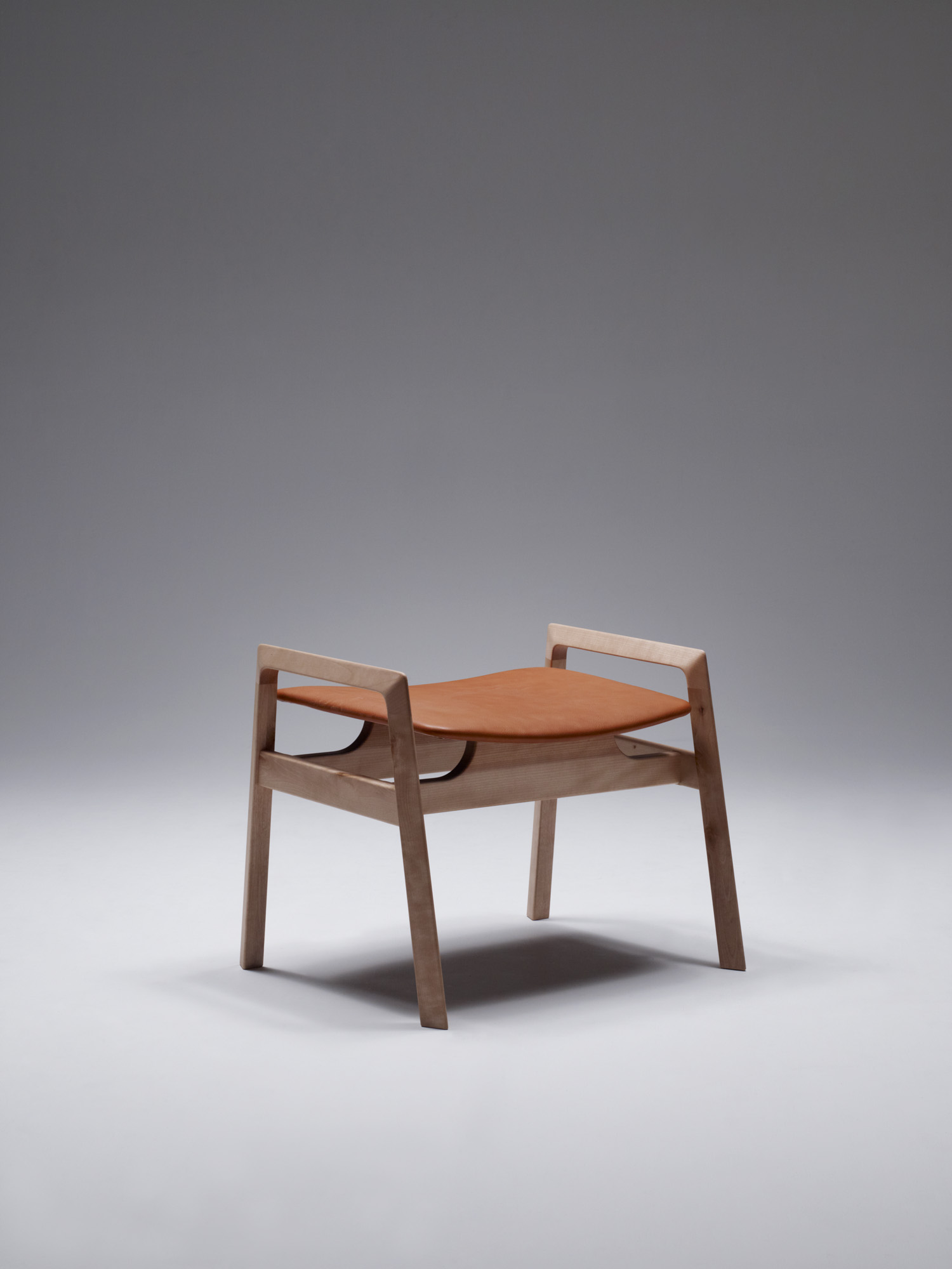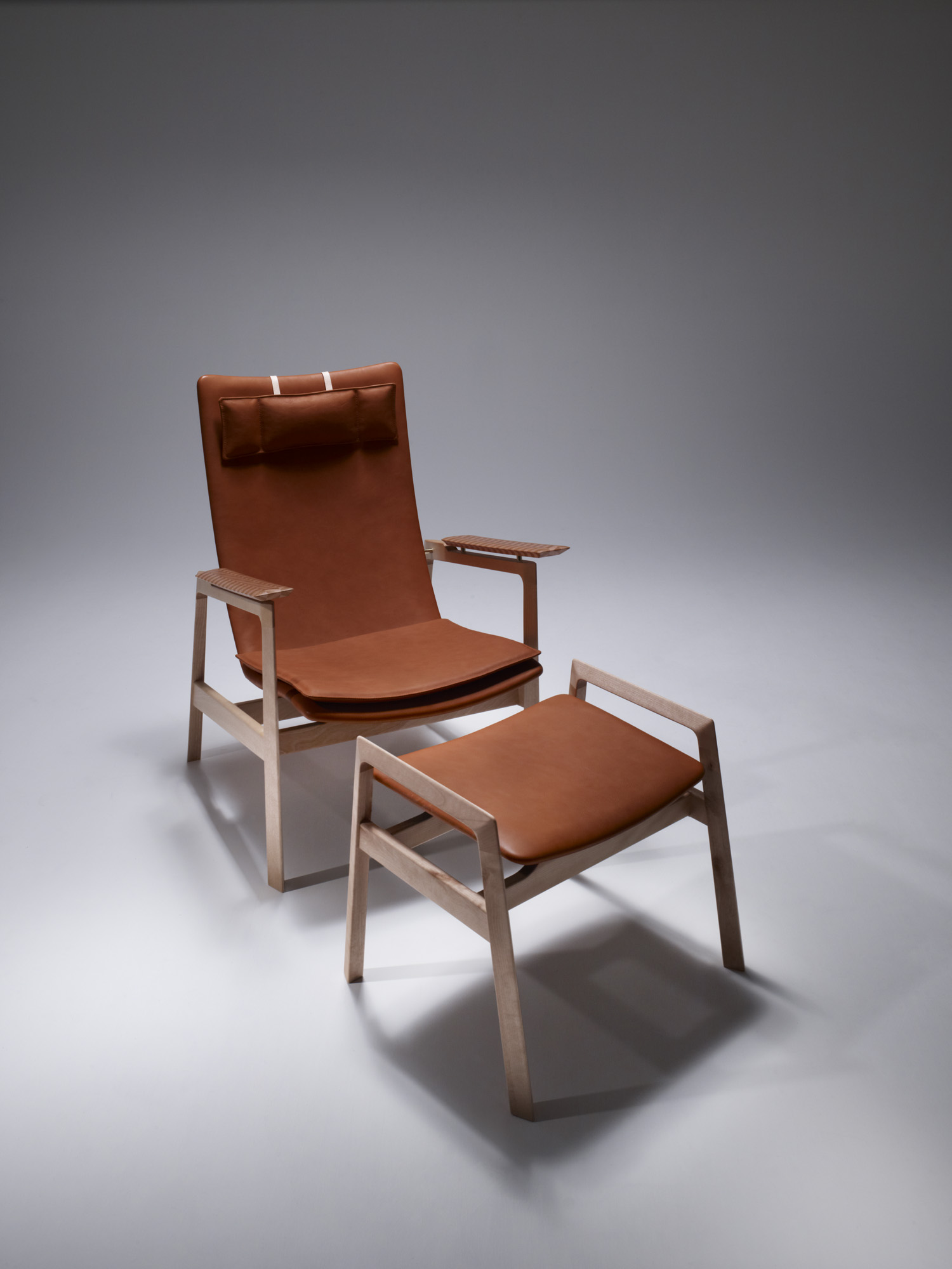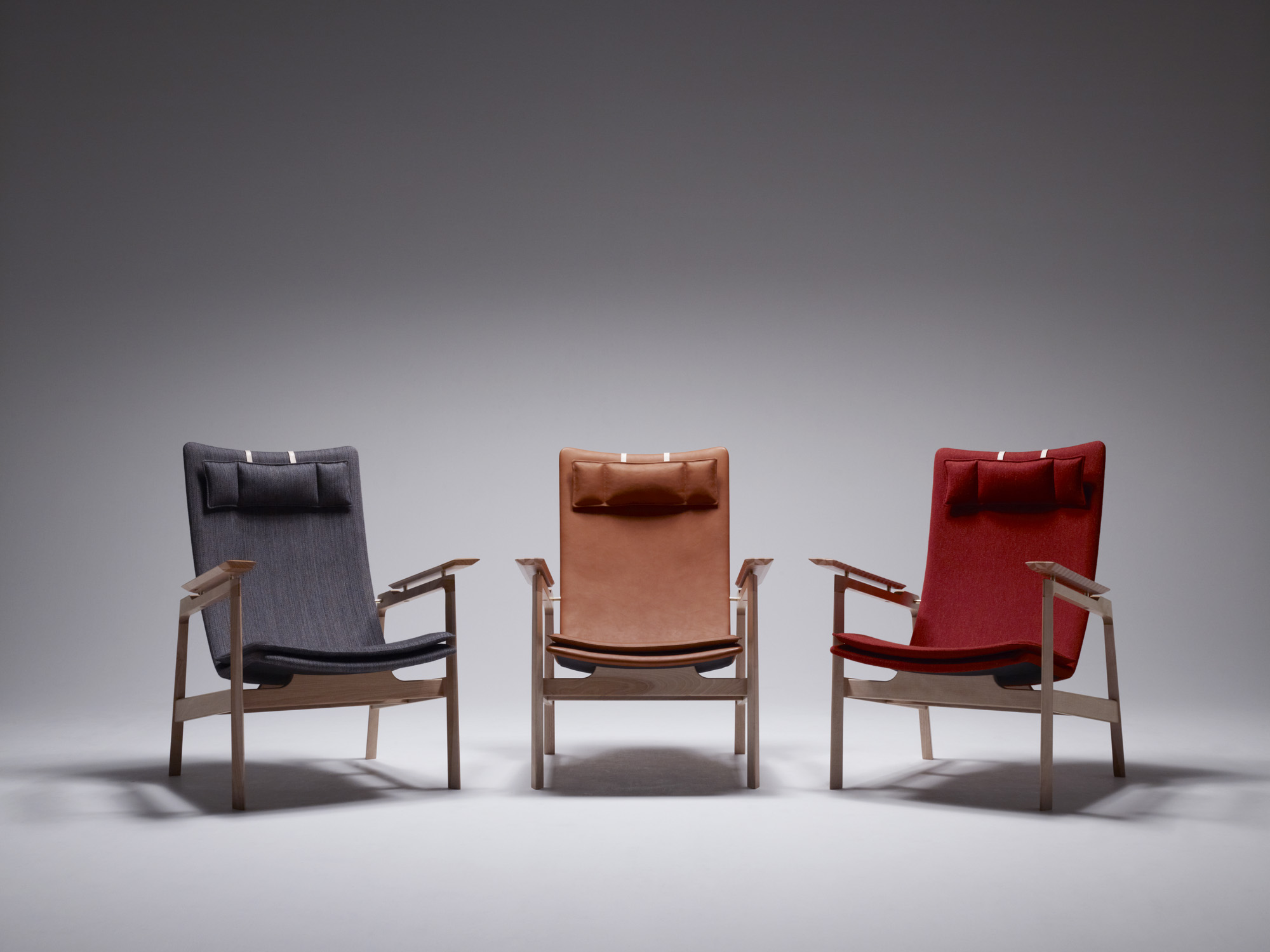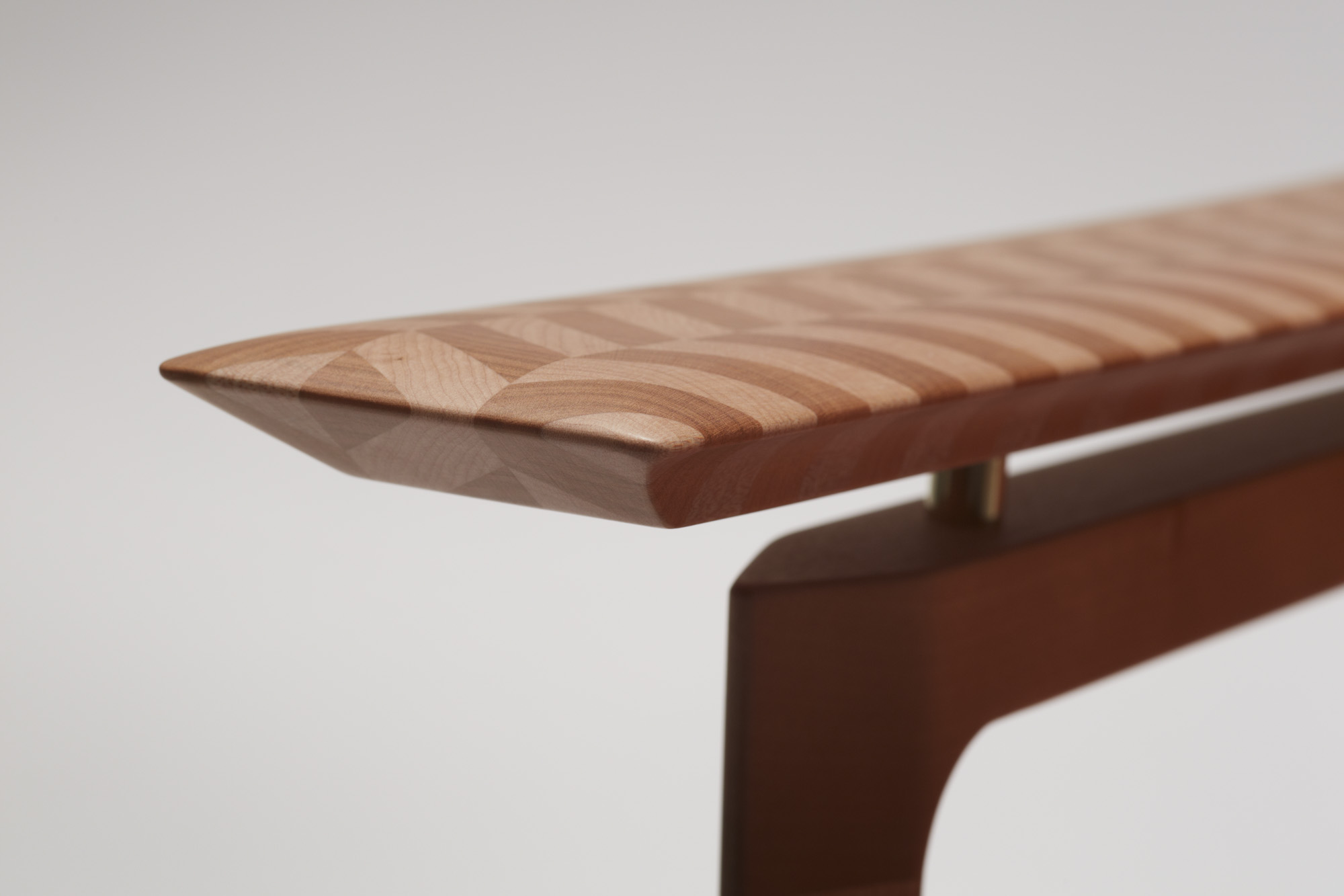 楓、桜の小口で構成されるヘリンボーンの肘を持つベカールラウンジチェアー。成形され磨かれた小口の触覚は、木材の新たな一面を教えてくれます。