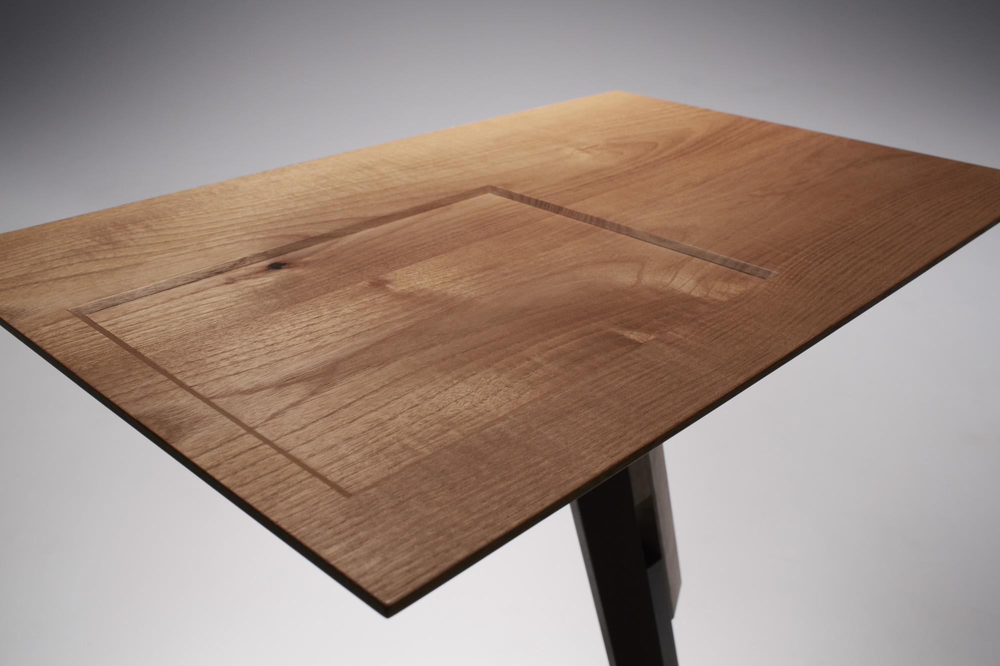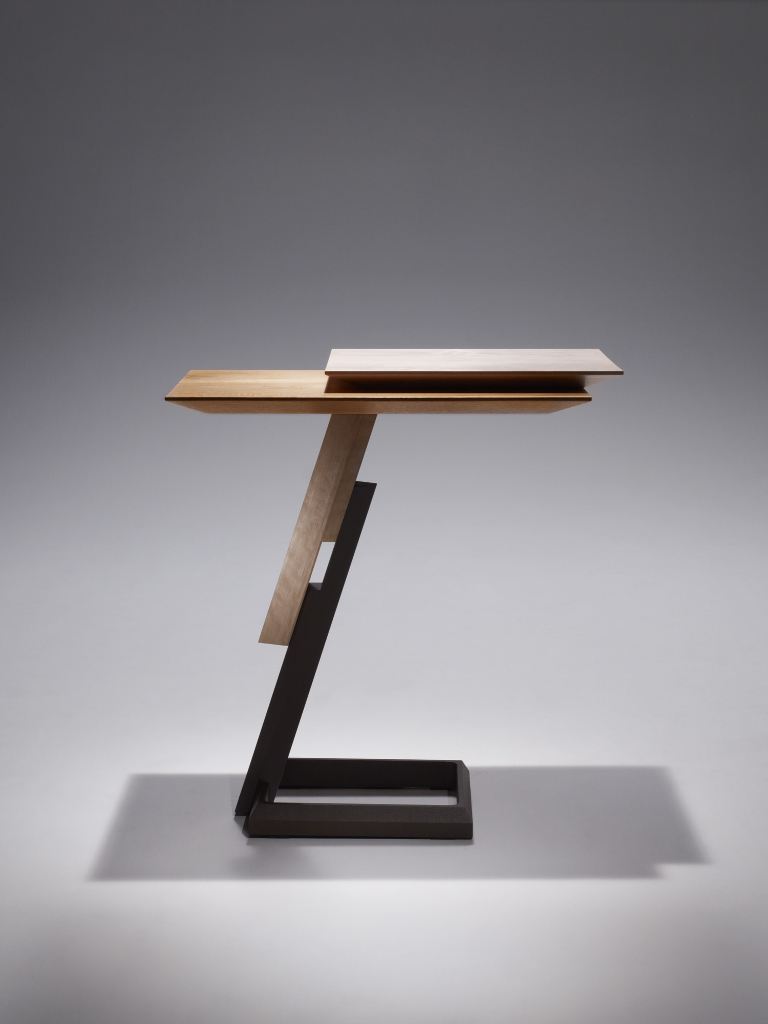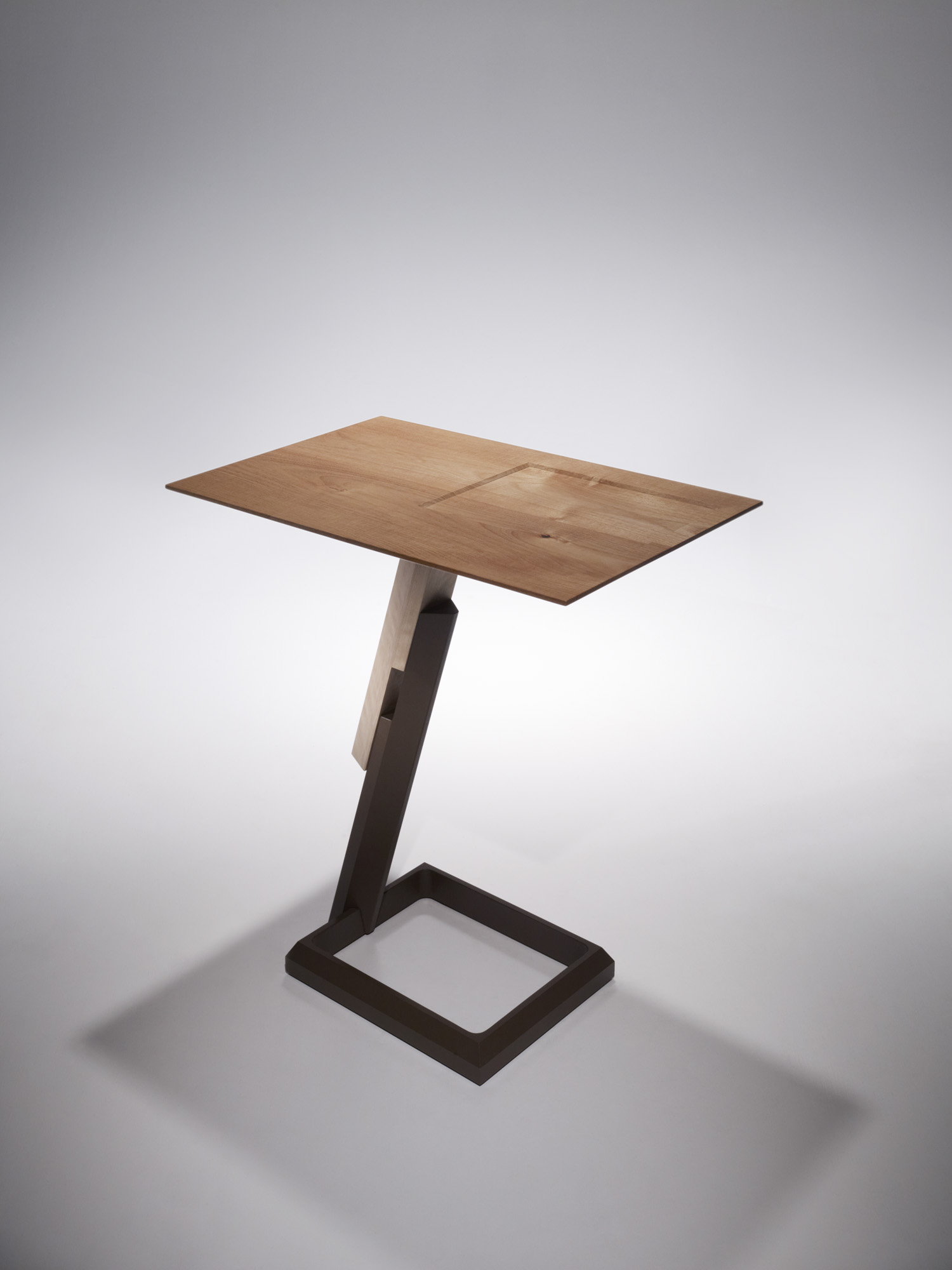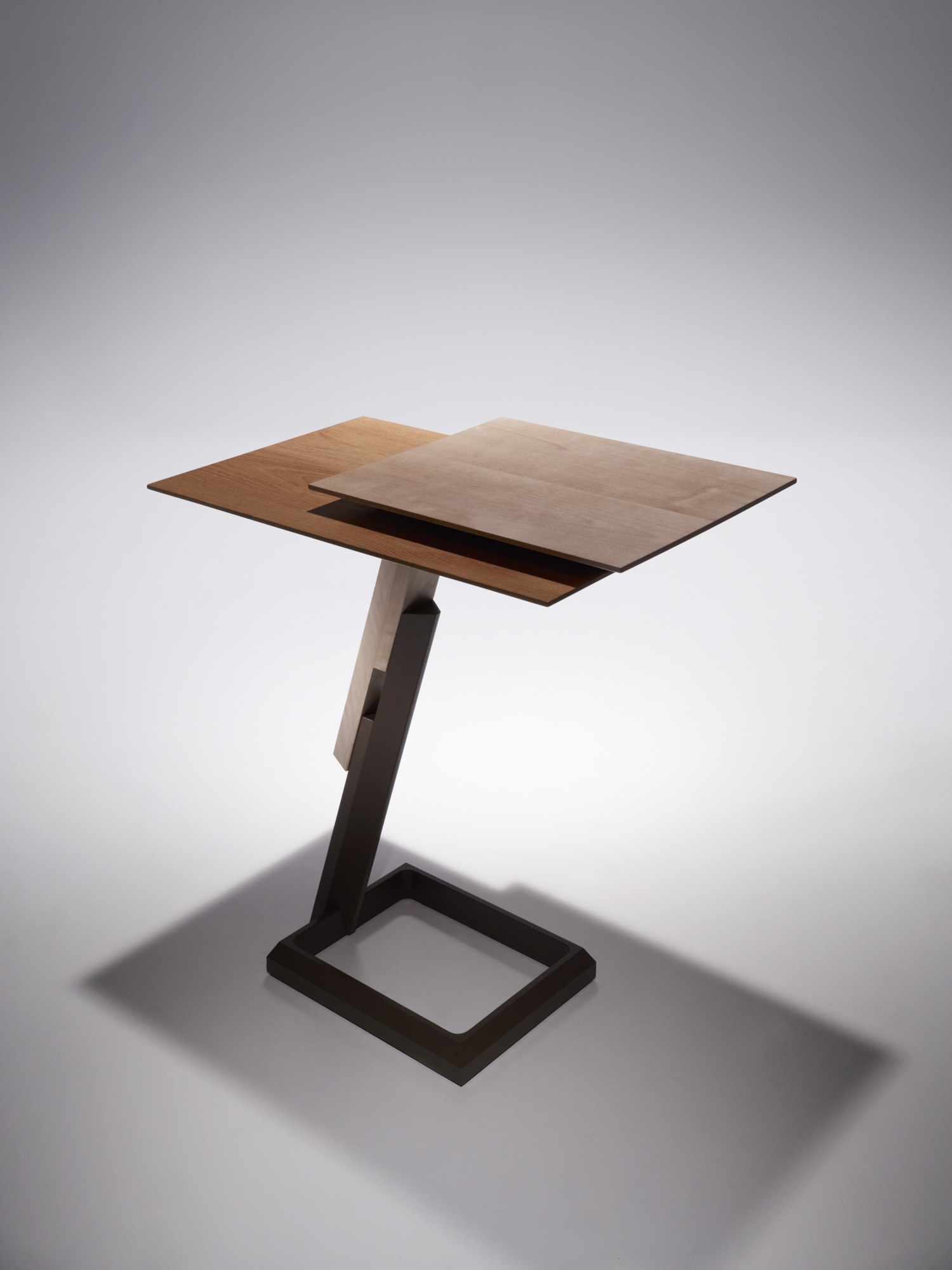 トレイで運び、そのまま天板にセットできるランテサイドテーブル。家具材としてはあまり普及していない固く独特の木目を持つ椣(しで)を木の支柱に、天板には存在感がありながらも優しい表情の玄圃梨(ケンポナシ)を使用しています。