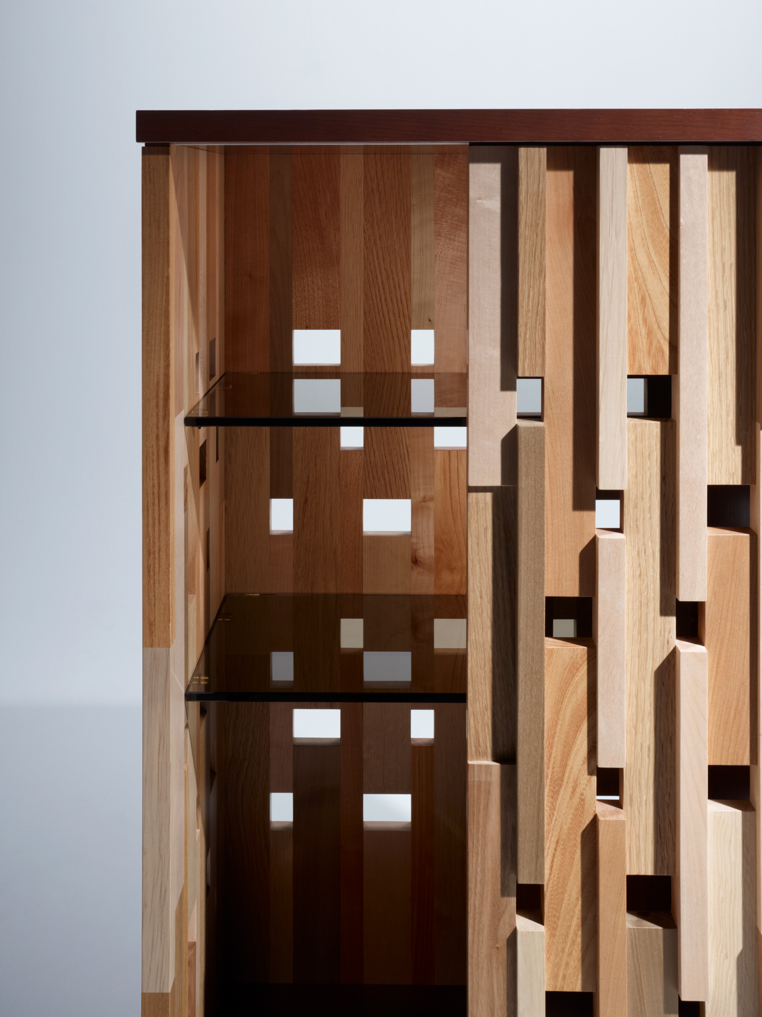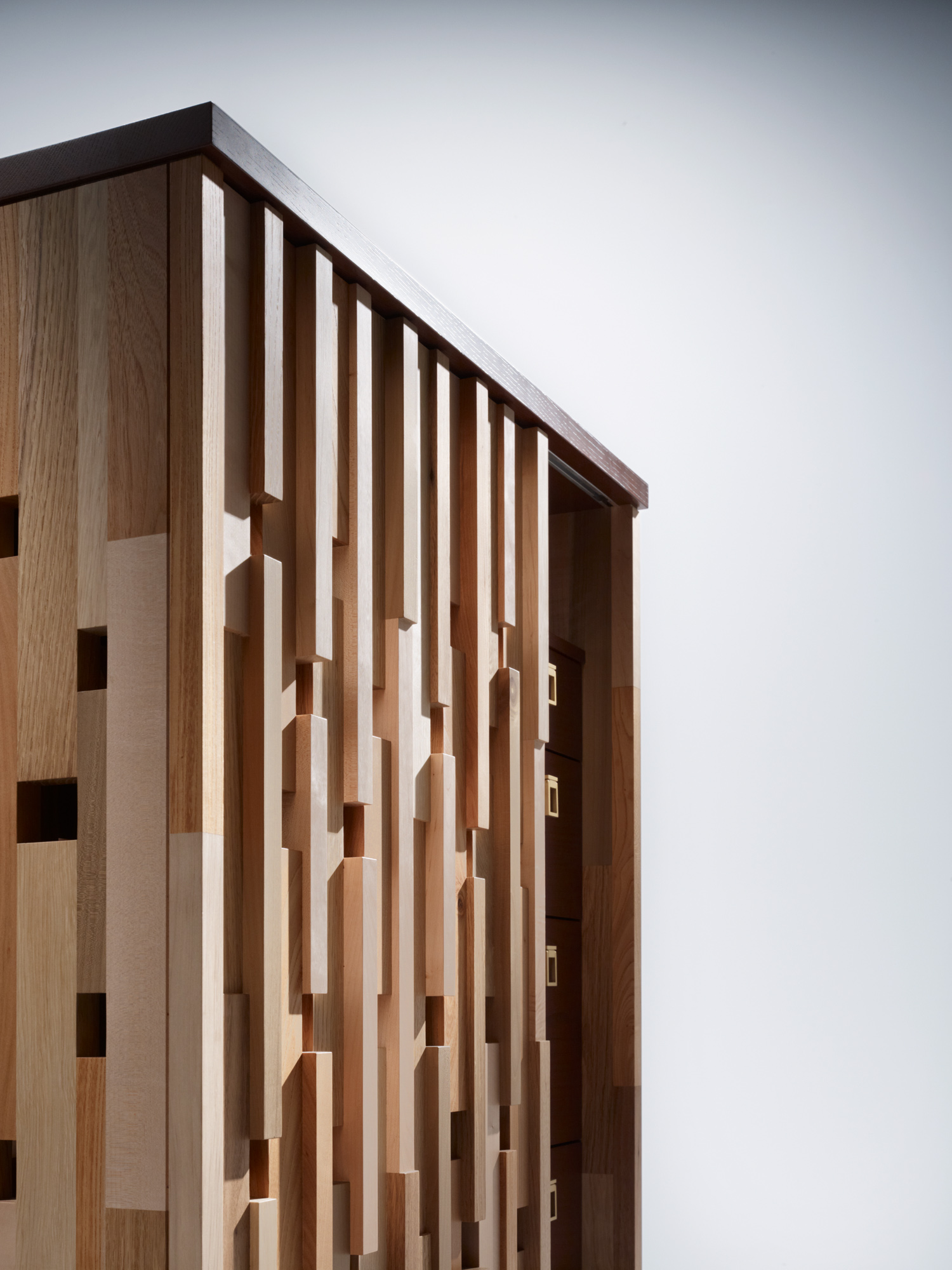 無垢材の自然の色や表情の違いをリズムと調和で表現し、光による陰影も取り込んだオスティナートシリーズ。オスティナートとはバロック音楽によく現れる、同じパターンやリズムを繰り返し反復させることで、聴く人に心地よさを感じさせる技法のことです。様々な樹種のパターンの反復が、見る人に心地よさを感じさせてくれます。