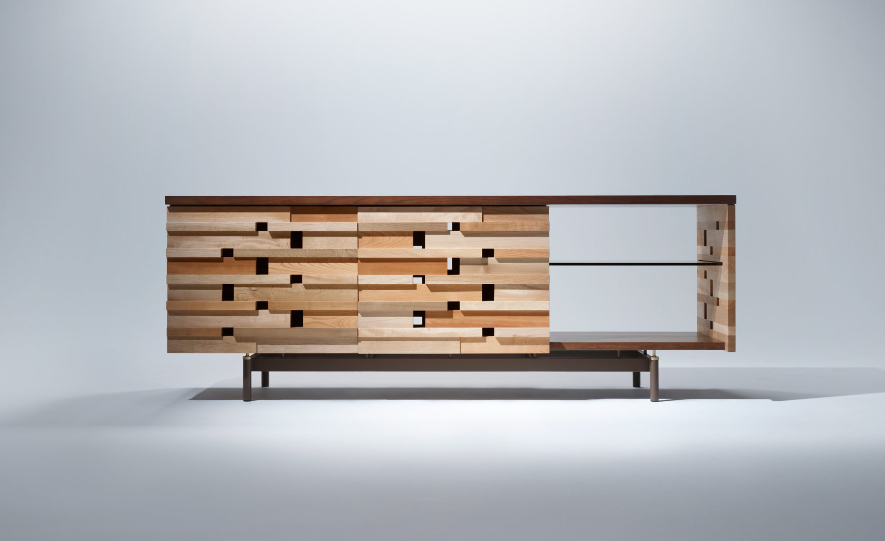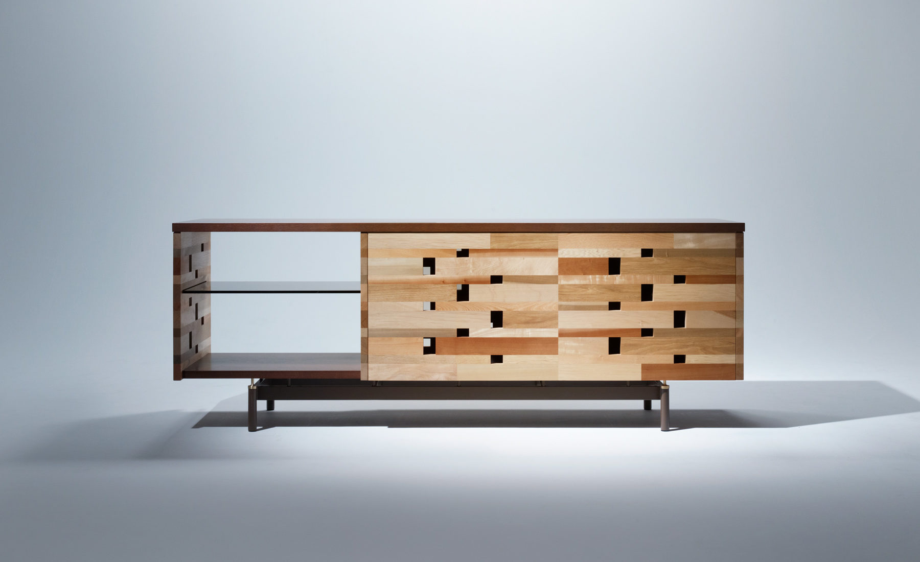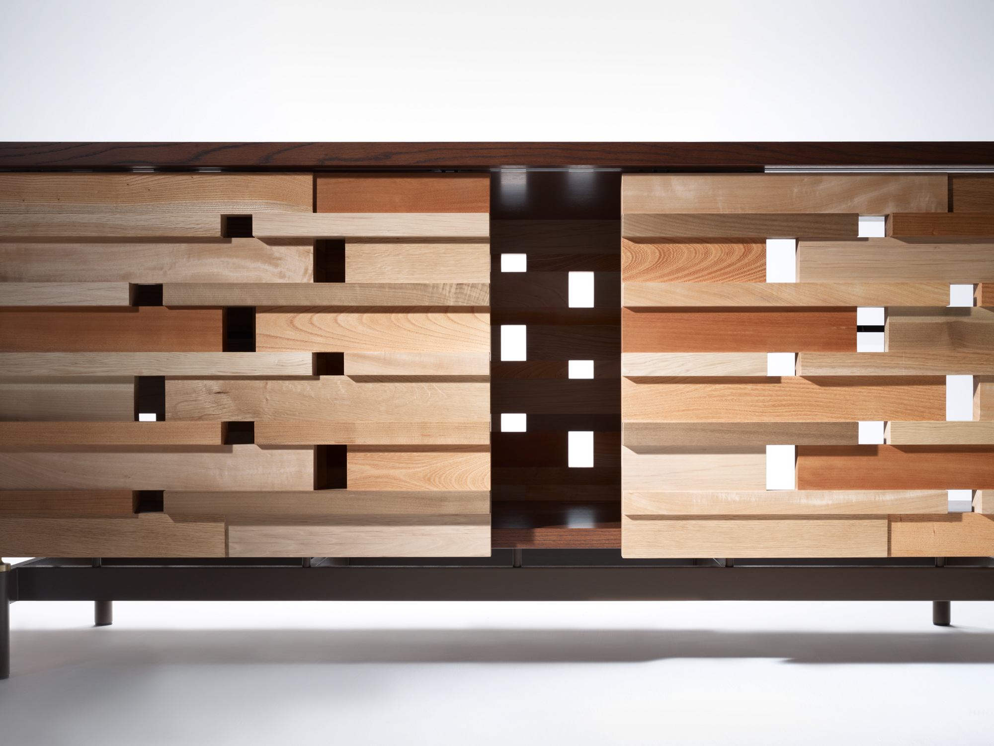 無垢材の自然の色や表情の違いをリズムと調和で表現し、光による陰影も取り込んだオスティナートシリーズ。オスティナートとはバロック音楽によく現れる、同じパターンやリズムを繰り返し反復させることで、聴く人に心地よさを感じさせる技法のことです。様々な樹種のパターンの反復が、見る人に心地よさを感じさせてくれます。