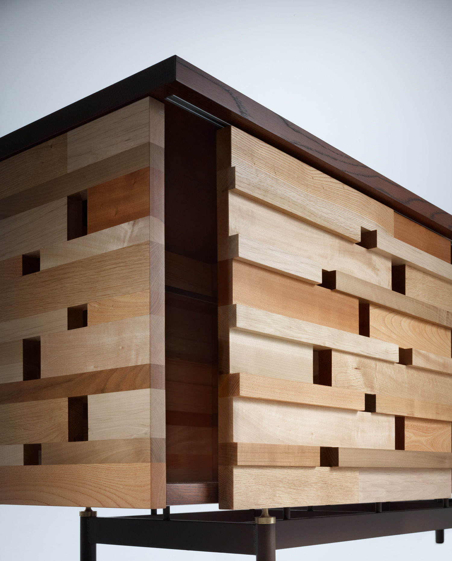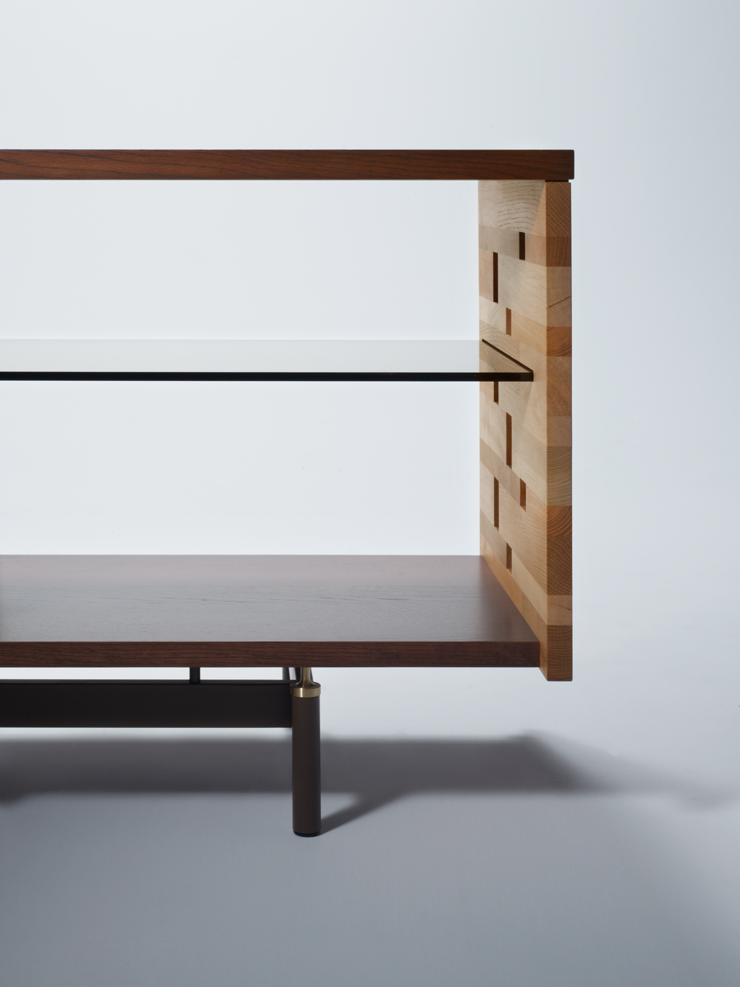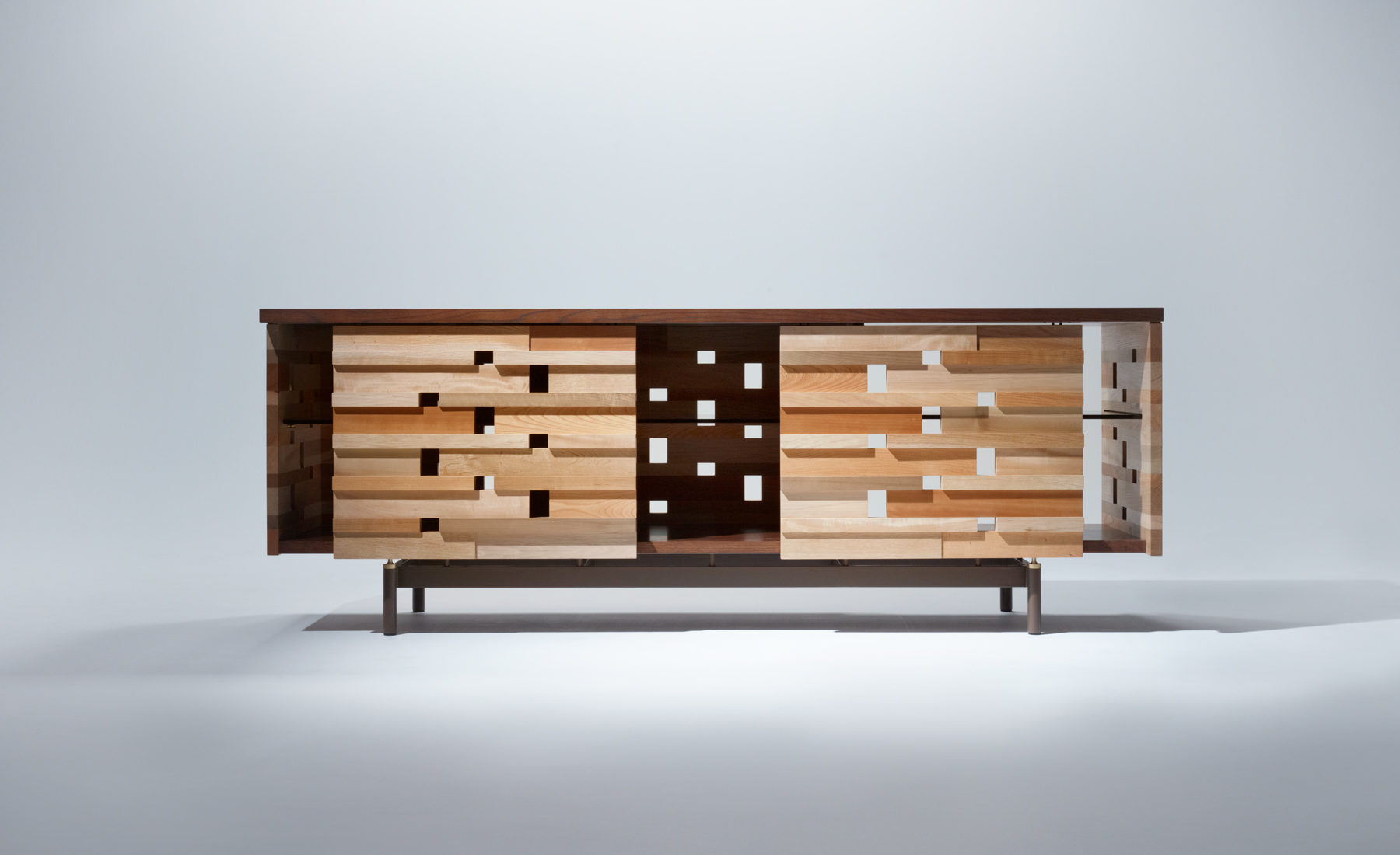無垢材の自然の色や表情の違いをリズムと調和で表現し、光による陰影も取り込んだオスティナートシリーズ。オスティナートとはバロック音楽によく現れる、同じパターンやリズムを繰り返し反復させることで、聴く人に心地よさを感じさせる技法のことです。様々な樹種のパターンの反復が、見る人に心地よさを感じさせてくれます。