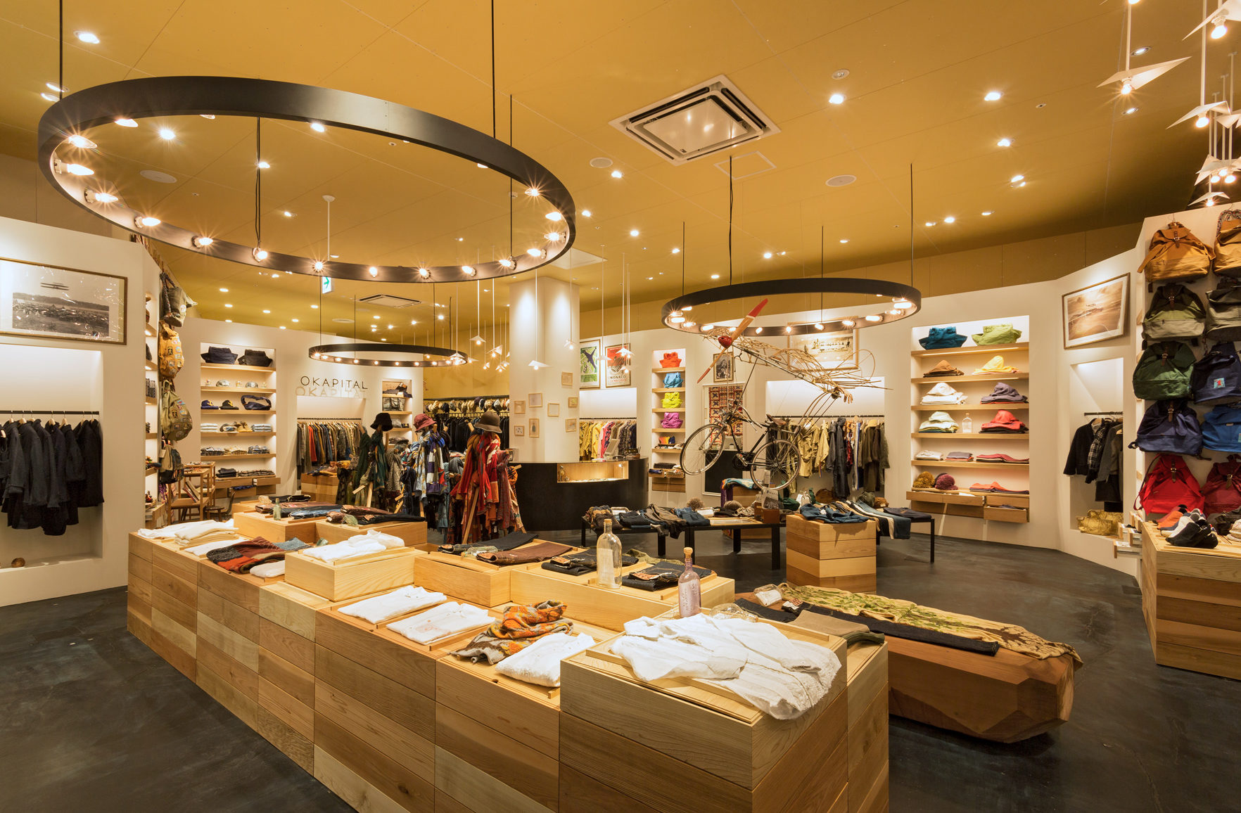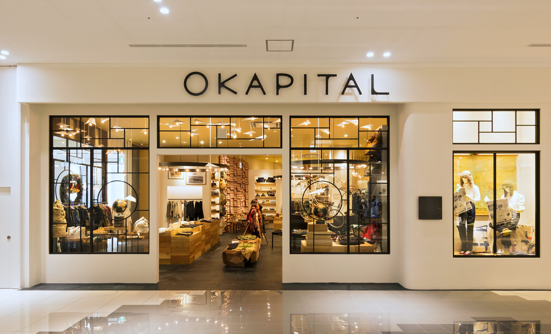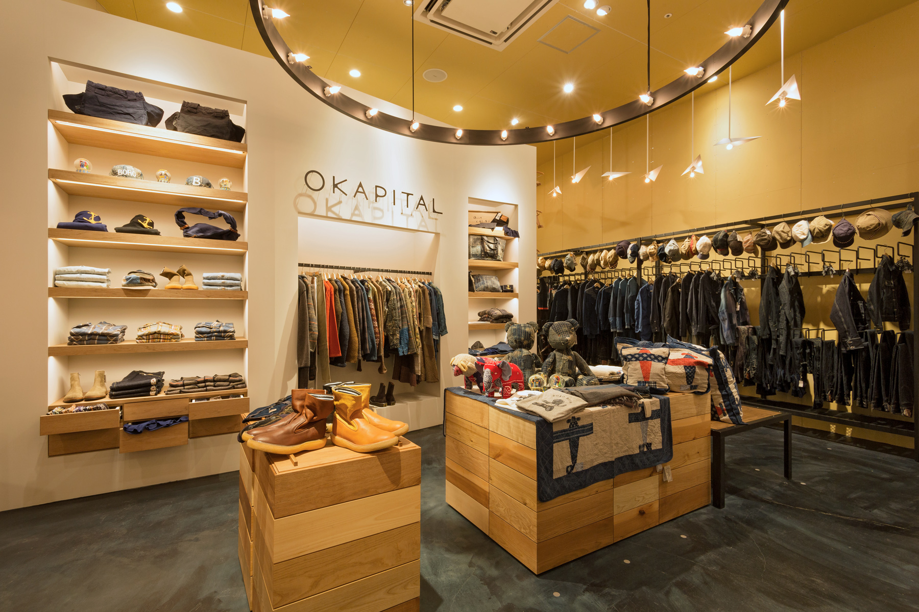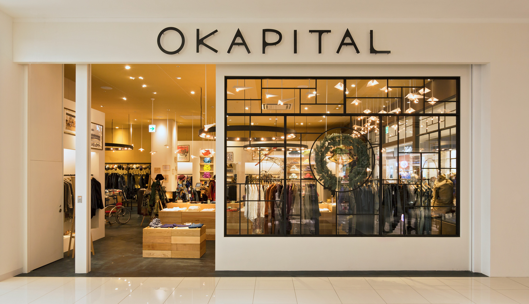 KAPITALの世界観を持ちつつ、より幅広い人に着てもらいたい。そんな思いで始まったOKAYAMA+KAPITAL=『 OKAPITAL 』は2014年12月、イオンモール岡山にオープンしました。『 AVIATOR・飛行家 』のテーマのもと、店内にDisplayされた羽つき自転車のほか、飛行機型ハンガーや紙飛行機モチーフのペンダント照明が、店内にリズムを生みながらその世界観を助長します。躯体壁面の大半、天井は石膏ボードそのままの仕上げとし、白く塗装された新しい壁面が折り曲がりながら面を構成し商品を展示しています。店頭に設置した樹齢約500年のレッドシダーの平台は、力強さと緻密な美しさを持って迎えてくれます。