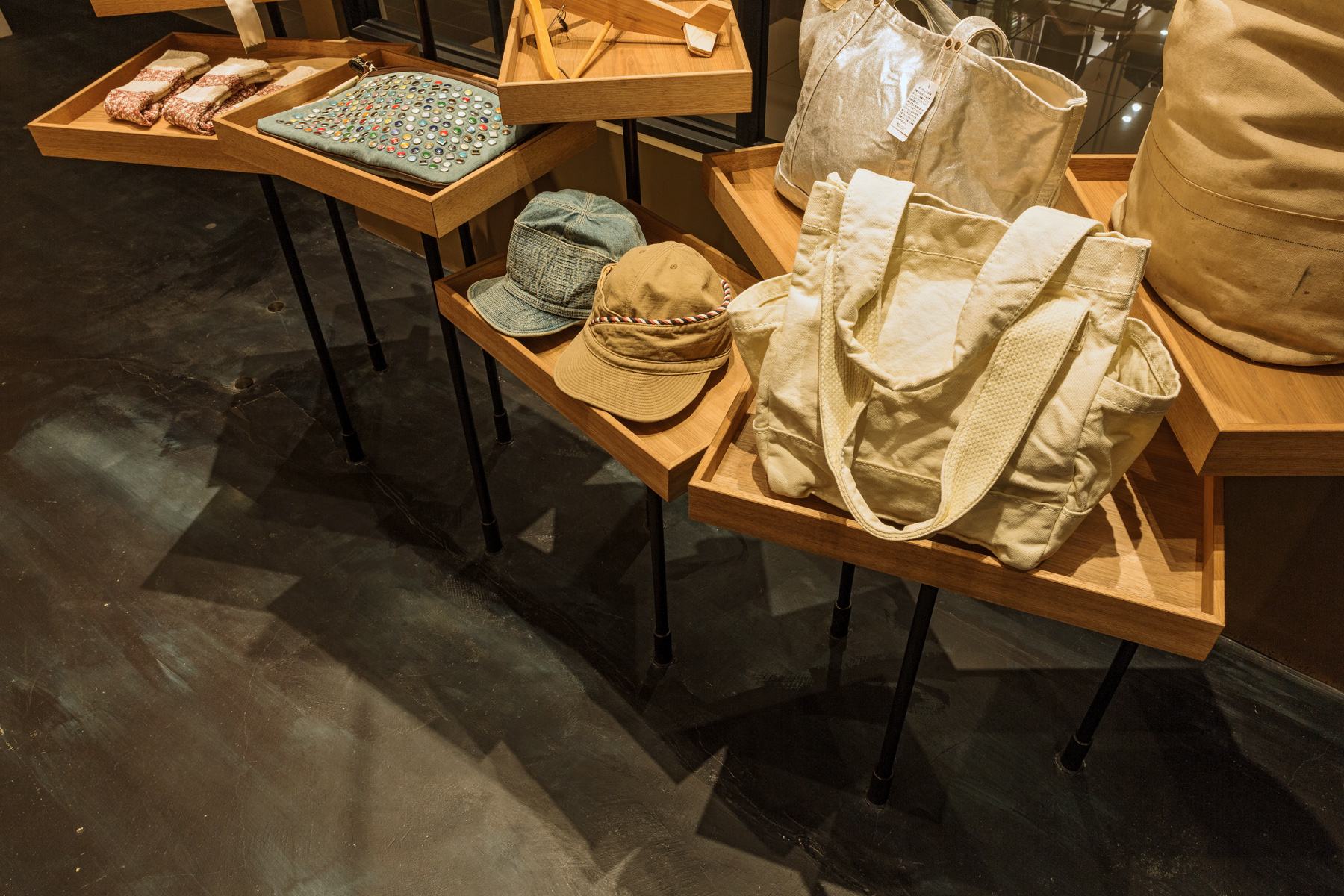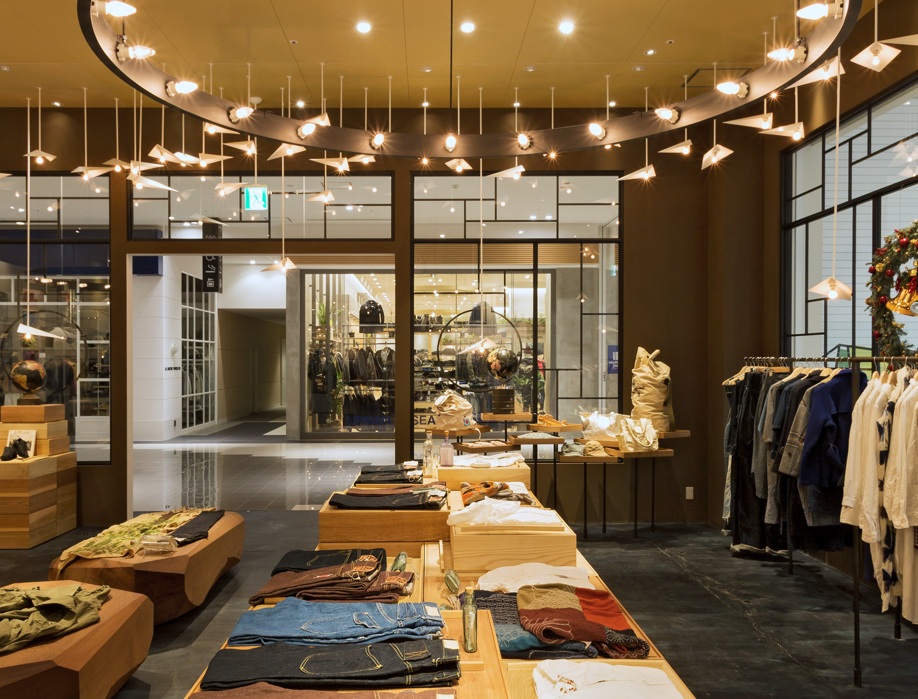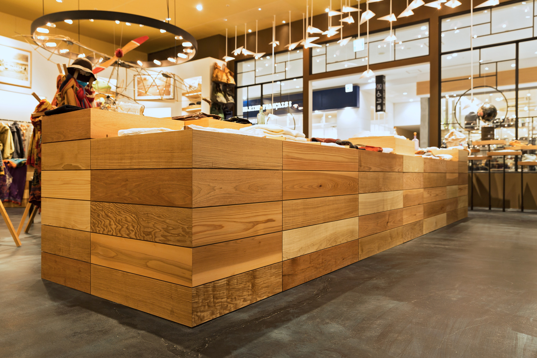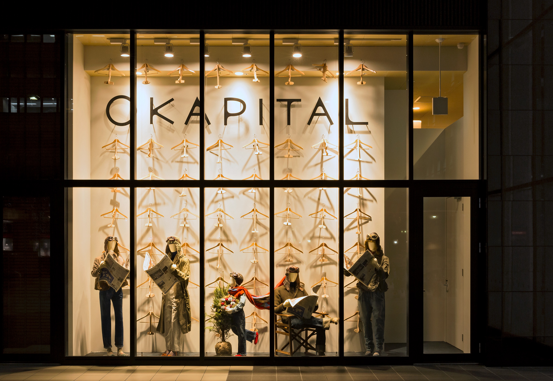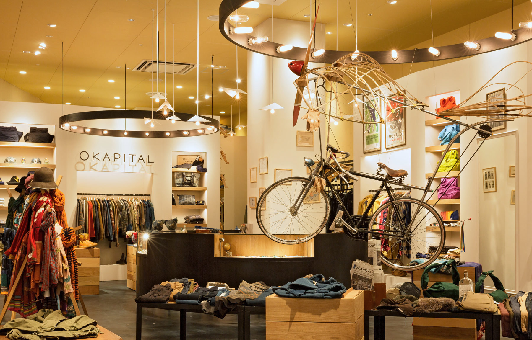 KAPITALの世界観を持ちつつ、より幅広い人に着てもらいたい。そんな思いで始まったOKAYAMA+KAPITAL=『 OKAPITAL 』は2014年12月、イオンモール岡山にオープンしました。『 AVIATOR・飛行家 』のテーマのもと、店内にDisplayされた羽つき自転車のほか、飛行機型ハンガーや紙飛行機モチーフのペンダント照明が、店内にリズムを生みながらその世界観を助長します。躯体壁面の大半、天井は石膏ボードそのままの仕上げとし、白く塗装された新しい壁面が折り曲がりながら面を構成し商品を展示しています。店頭に設置した樹齢約500年のレッドシダーの平台は、力強さと緻密な美しさを持って迎えてくれます。