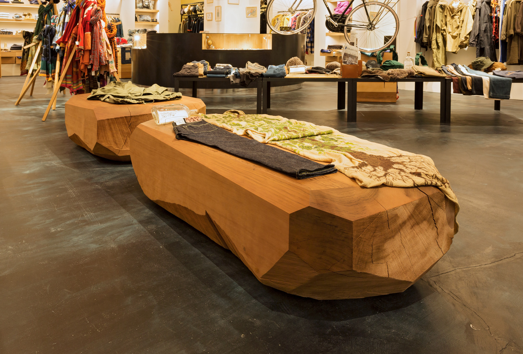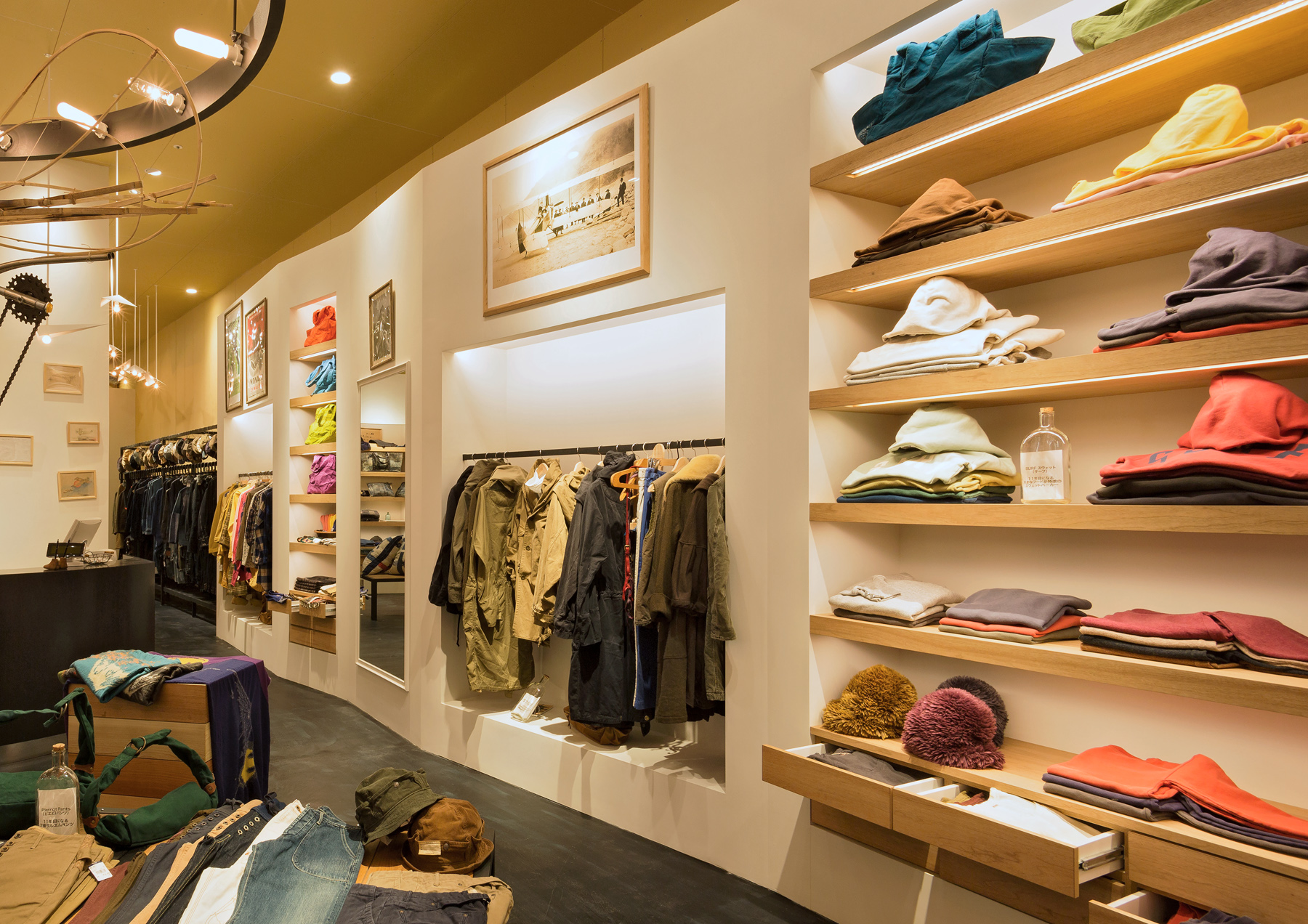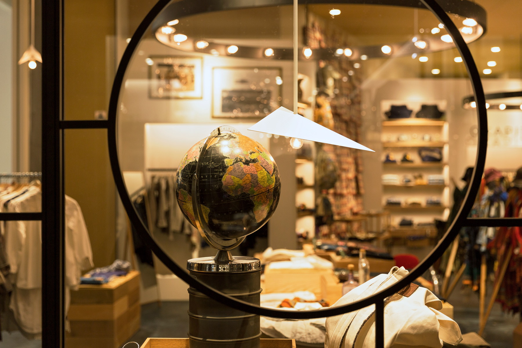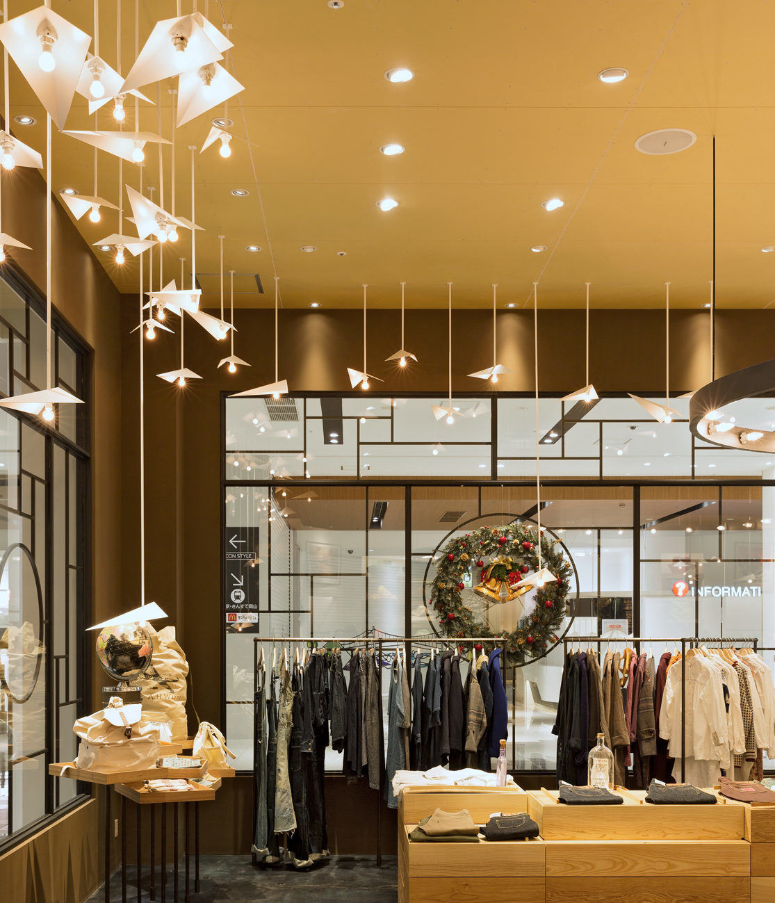 KAPITALの世界観を持ちつつ、より幅広い人に着てもらいたい。そんな思いで始まったOKAYAMA+KAPITAL=『 OKAPITAL 』は2014年12月、イオンモール岡山にオープンしました。『 AVIATOR・飛行家 』のテーマのもと、店内にDisplayされた羽つき自転車のほか、飛行機型ハンガーや紙飛行機モチーフのペンダント照明が、店内にリズムを生みながらその世界観を助長します。躯体壁面の大半、天井は石膏ボードそのままの仕上げとし、白く塗装された新しい壁面が折り曲がりながら面を構成し商品を展示しています。店頭に設置した樹齢約500年のレッドシダーの平台は、力強さと緻密な美しさを持って迎えてくれます。