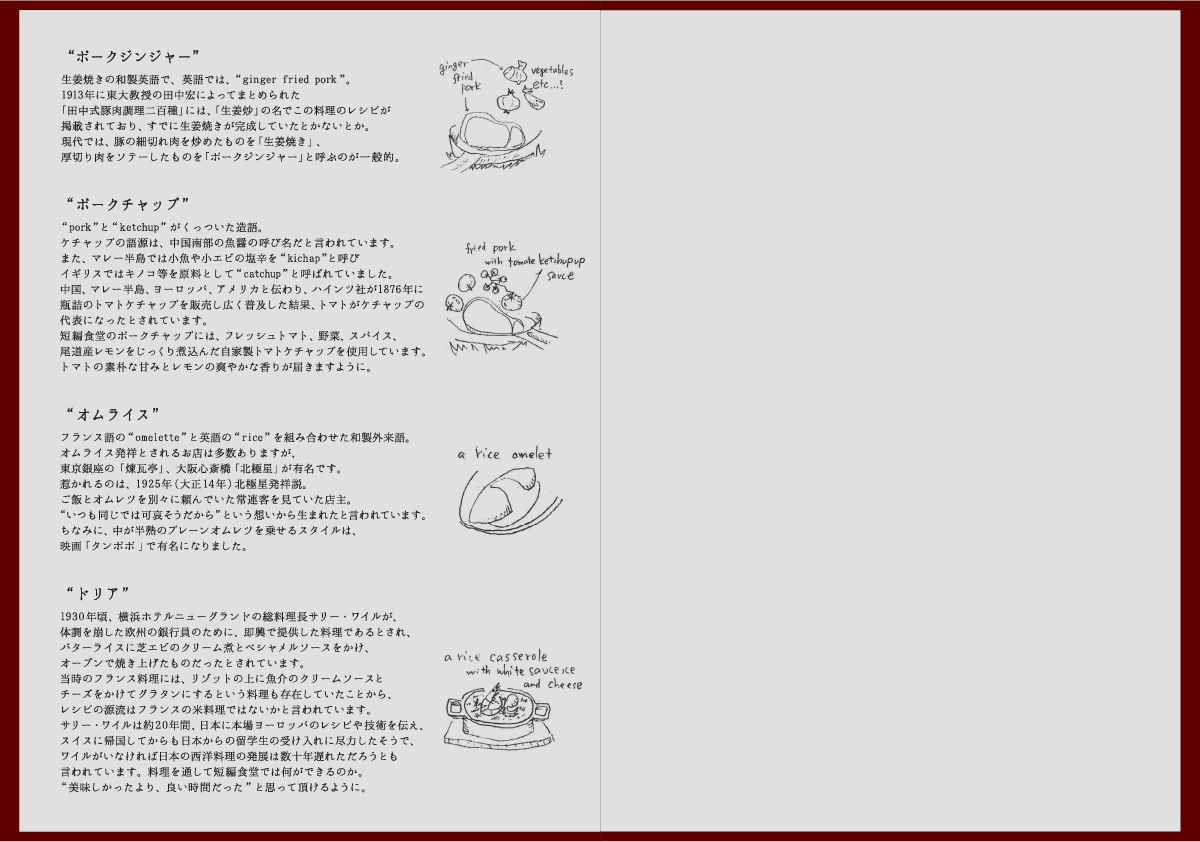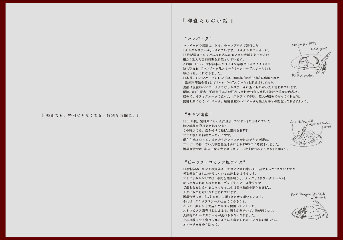 洋食屋のネーミング、ロゴ、メニュー表のデザイン。この場所で過ごす時間がそれぞれの短編小説になるように願いを込めて『短編食堂』と名付け、ロゴをデザインしました。メニューの中で普段何気なく食べている『洋食たちの小話』を起源などを含めて紹介しています。